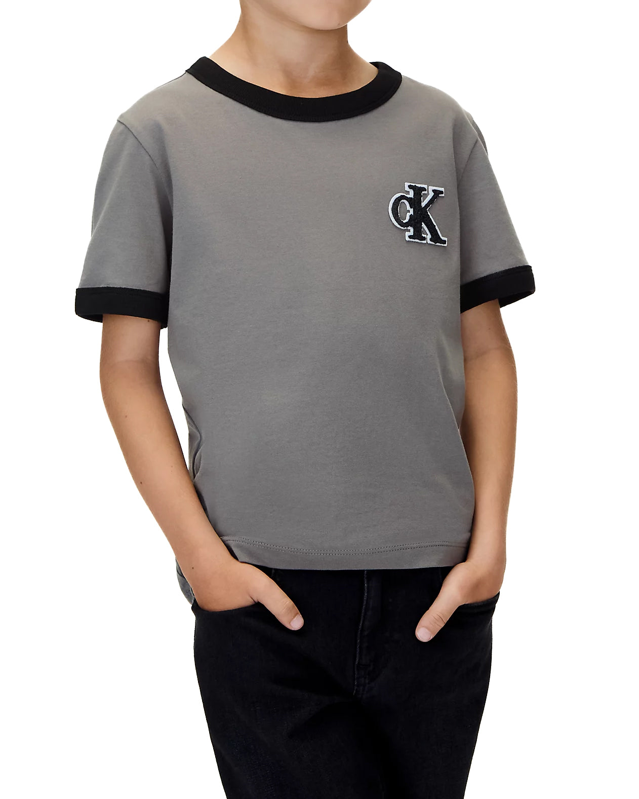 Calvin Klein Kids T-Shirt Grigia con Dettagli Neri a Contrasto e Patch Logo a Contrasto per Bambini