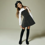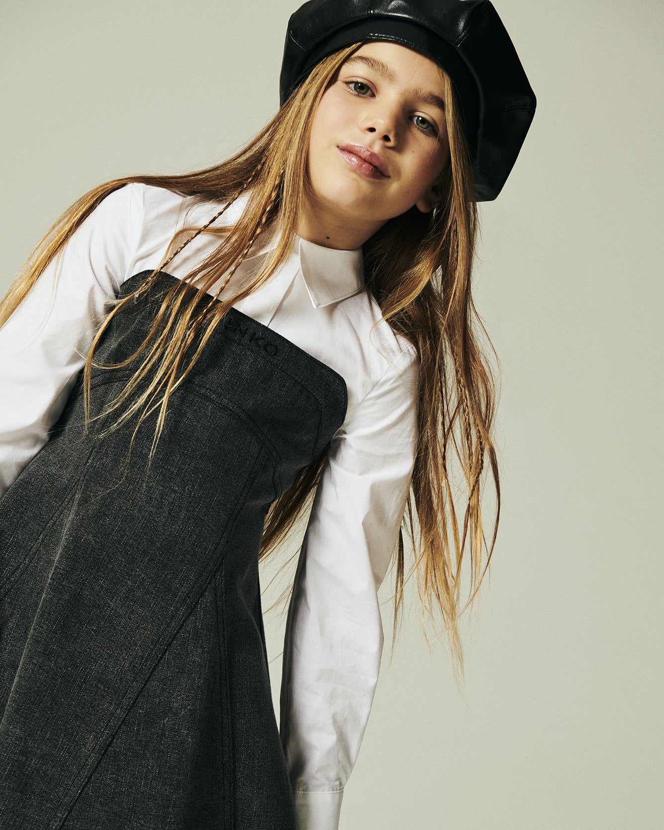 L’abito Pinko Kids in denim grigio con camicia bianca integrata è la perfetta combinazione tra eleganza e carattere. Il design due-in-uno unisce una parte superiore in tessuto bianco effetto camicia con colletto classico e maniche lunghe, e una parte inferiore in denim strutturato effetto corsetto con logo PINKO tono su tono sul petto. La gonna svasata aggiunge movimento e femminilità, rendendo questo vestito ideale per occasioni speciali o look raffinati da tutti i giorni.
