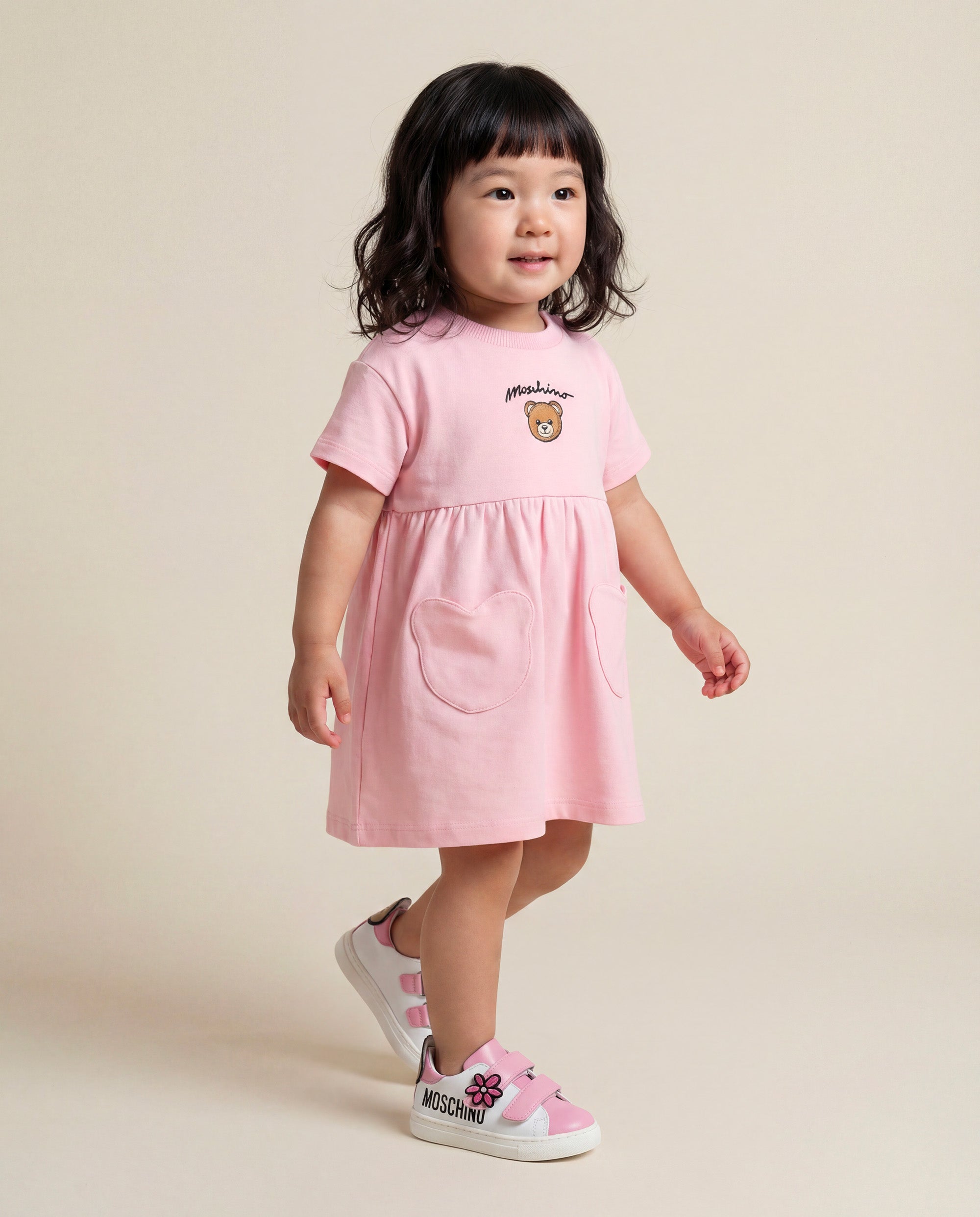 Abito Moschino Kids in vivace tonalità rosa, impreziosito dall’iconica stampa Teddy Bear con logo frontale a contrasto. Un capo dal carattere deciso e contemporaneo, pensato per dare energia e stile ai look delle più piccole.