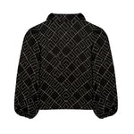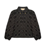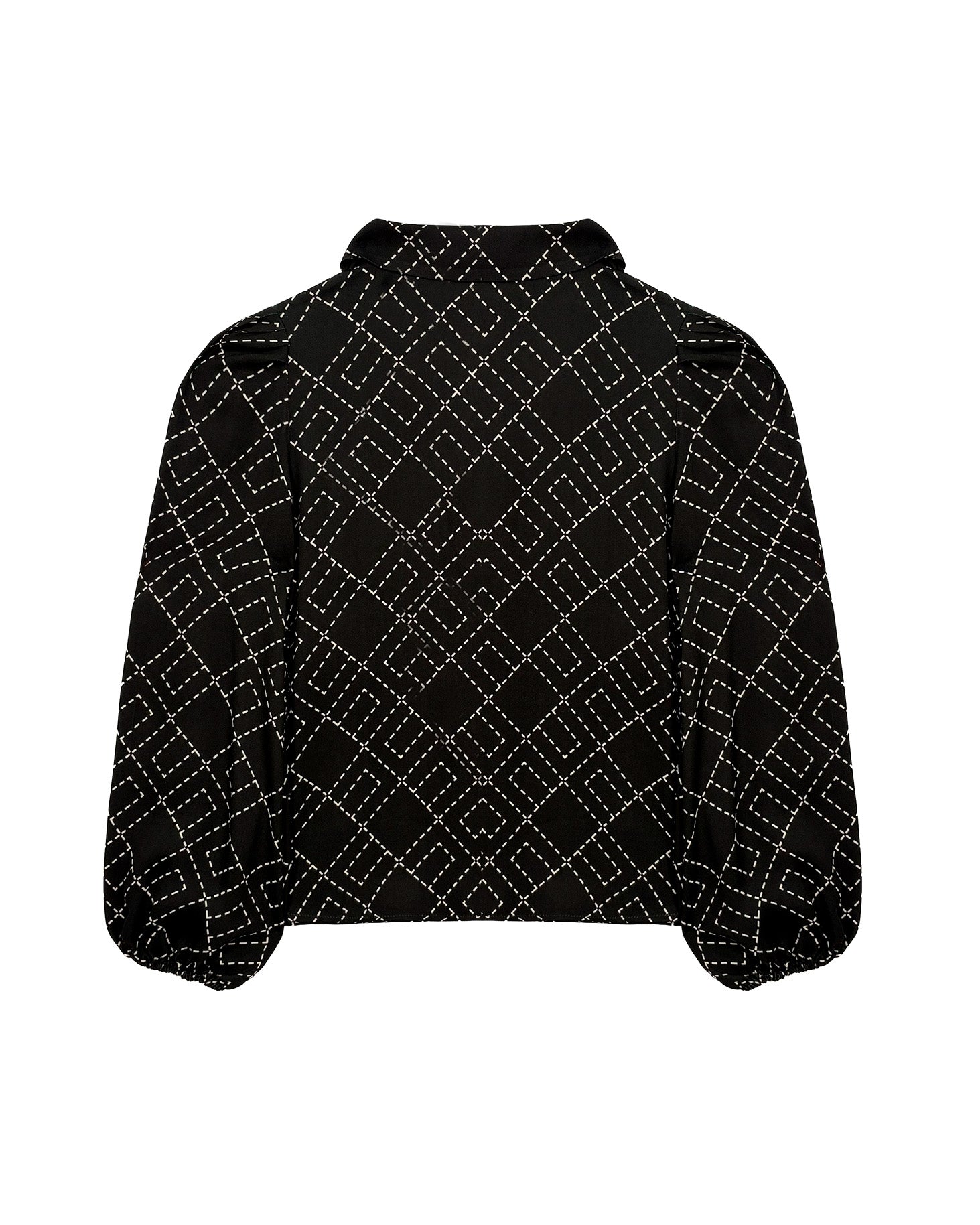 Il design nero è impreziosito da un motivo multilogo geometrico a contrasto, che dona un tocco distintivo e contemporaneo al modello. Perfetta per occasioni speciali o per creare look ricercati anche nella quotidianità, si abbina facilmente a gonne e pantaloni della collezione.