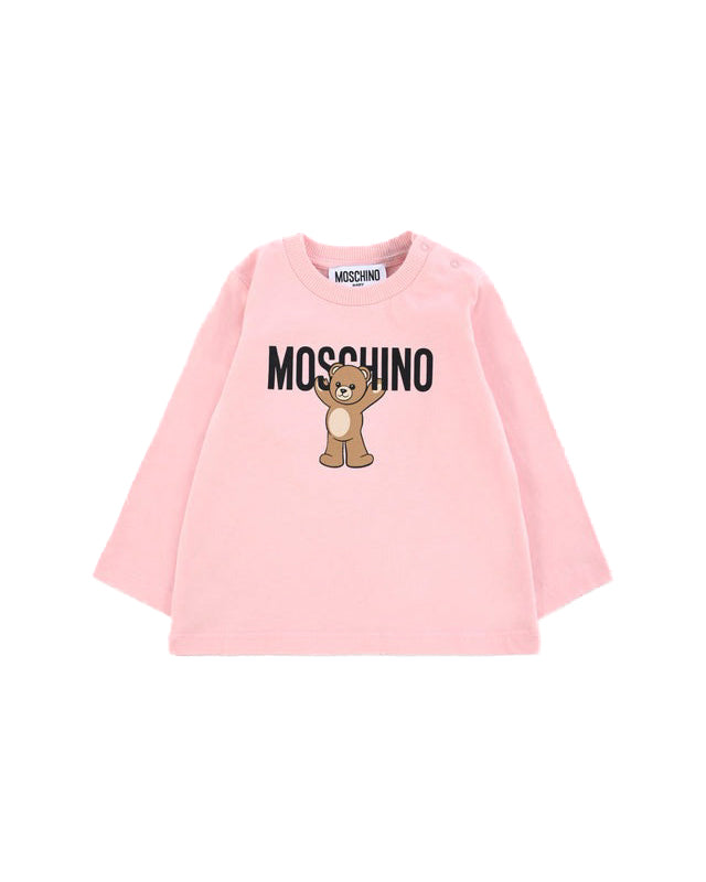 Il capo è arricchito da una delicata stampa con Teddy Bear iconico Moschino e dal logo in evidenza sul davanti, per un mix di tenerezza e stile. Ideale da abbinare a tutine coordinate o leggings, questa t-shirt unisce sostenibilità, dolcezza e riconoscibilità firmata Moschino per i momenti più coccolosi.