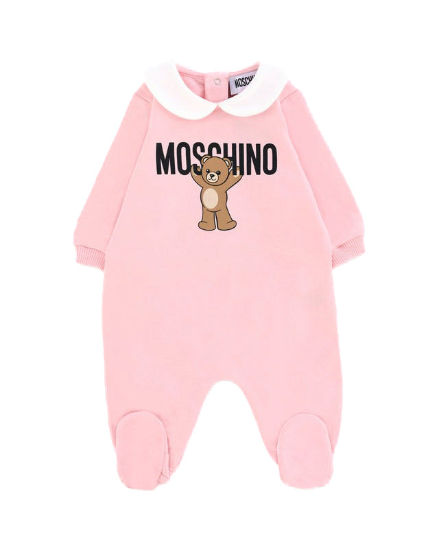 La tutina rosa Moschino Kids per neonate è un capo esclusivo pensato per regalare stile fin dai primi momenti. Realizzata in cotone premium (possibilmente biologico o certificato), assicura comfort, morbidezza e delicatezza sulla pelle sensibile dei più piccoli. L’elemento distintivo è l’adorabile stampa dell’orsetto Teddy sul davanti, accompagnata da un elegante logo Moschino che conferisce un tocco fashion.