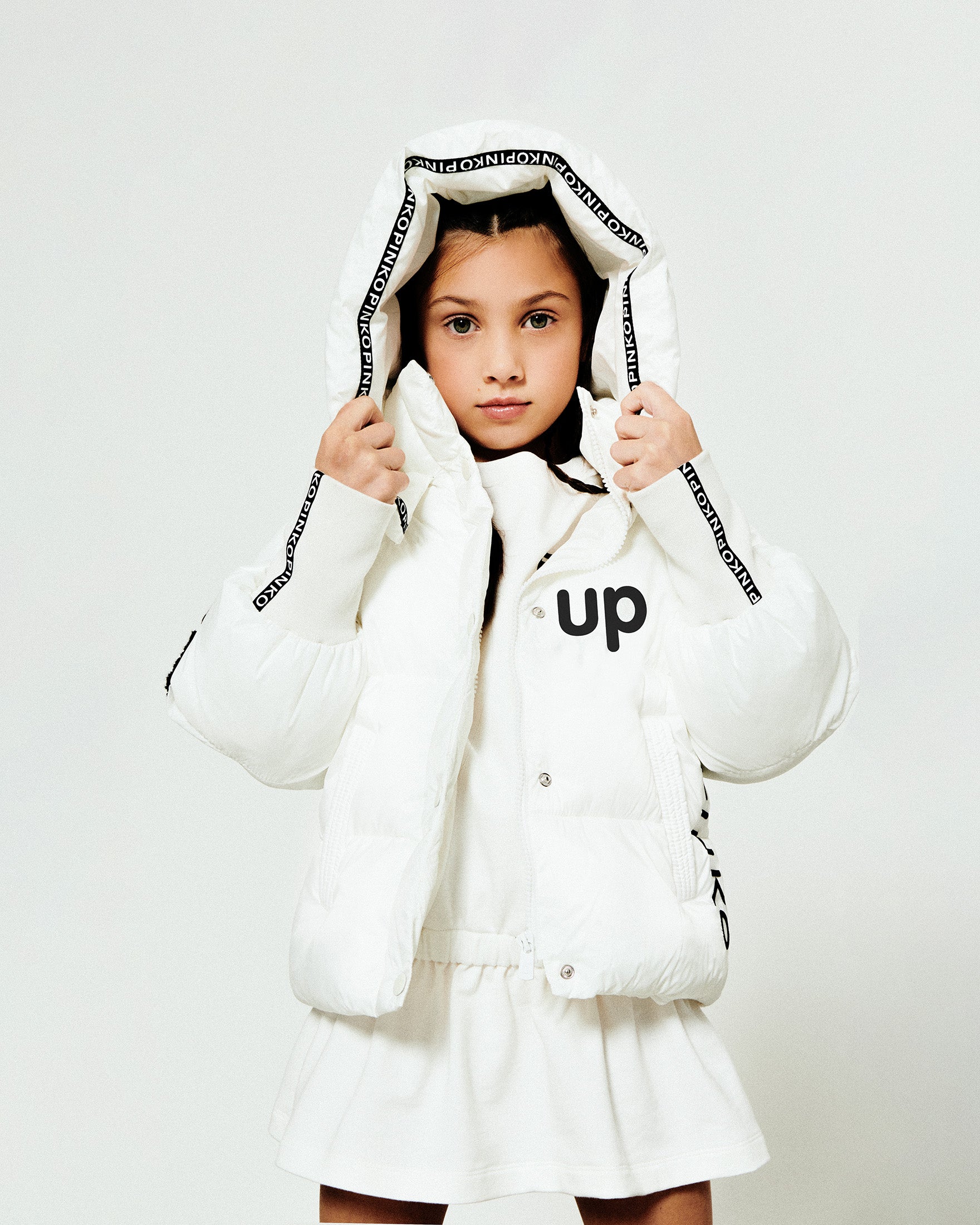 Il giubbino bomber Pinko Kids bianco con cappuccio unisce stile urbano e comfort invernale. Realizzato in tessuto trapuntato imbottito, offre calore e morbidezza senza rinunciare al tocco fashion tipico del brand. Caratterizzato da logo “UP” ricamato sul petto, dettagli con nastro logato Pinko Pinko e polsini a coste elasticizzate, questo piumino corto dona un look moderno e dinamico perfetto per le giornate più fredde.