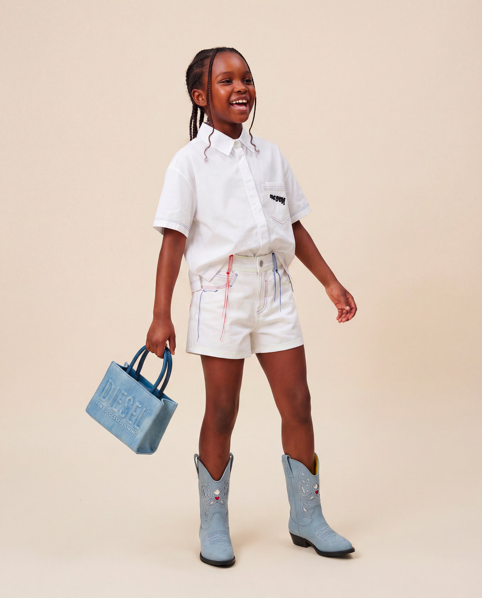 Unisce rigore sartoriale e creatività urban questa camicia a manica corta firmata MSGM Kids, pezzo chiave della collezione Primavera/Estate 2026. Realizzata in un pregiato popeline di cotone dalla mano compatta e leggera, la camicia presenta un colletto classico e una linea dritta versatile. Il design minimalista è vivacizzato da un taschino applicato sul petto e da maniche decorate con cuciture a contrasto multicolor. Il dettaglio distintivo è l'effetto grafico contemporaneo creato dai fili lasciati volutamente a vista, che incorniciano il taschino dove spicca il logo MSGM ricamato in nero. Un capo bianco essenziale che si trasforma in una dichiarazione di stile grazie ai suoi dettagli artistici "unfinished".
