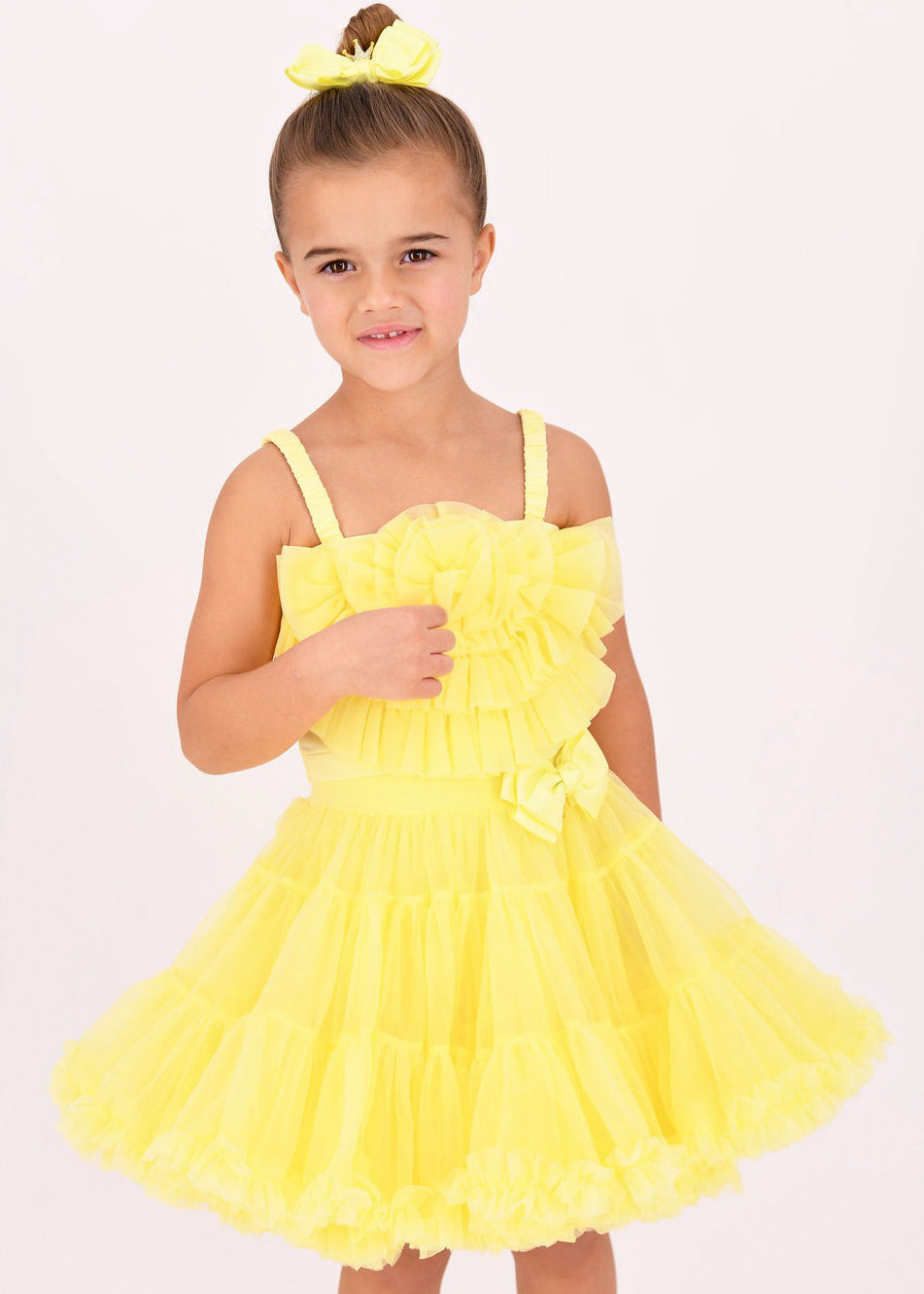 Top corto giallo Angel's Face per bambine, perfetto per un look elegante e giocoso. Realizzato con più strati di pizzo di tulle, questo top presenta un grazioso volant color giallo e un motivo a rosetta sul davanti, aggiungendo un tocco di dolcezza e raffinatezza. Il design si abbina perfettamente ai nostri iconici tutù Pixie nella stessa tonalità, creando un completo coordinato che unisce comfort e stile. Leggero e delicato sulla pelle, questo top è ideale per occasioni speciali o per un look estivo da principessa.