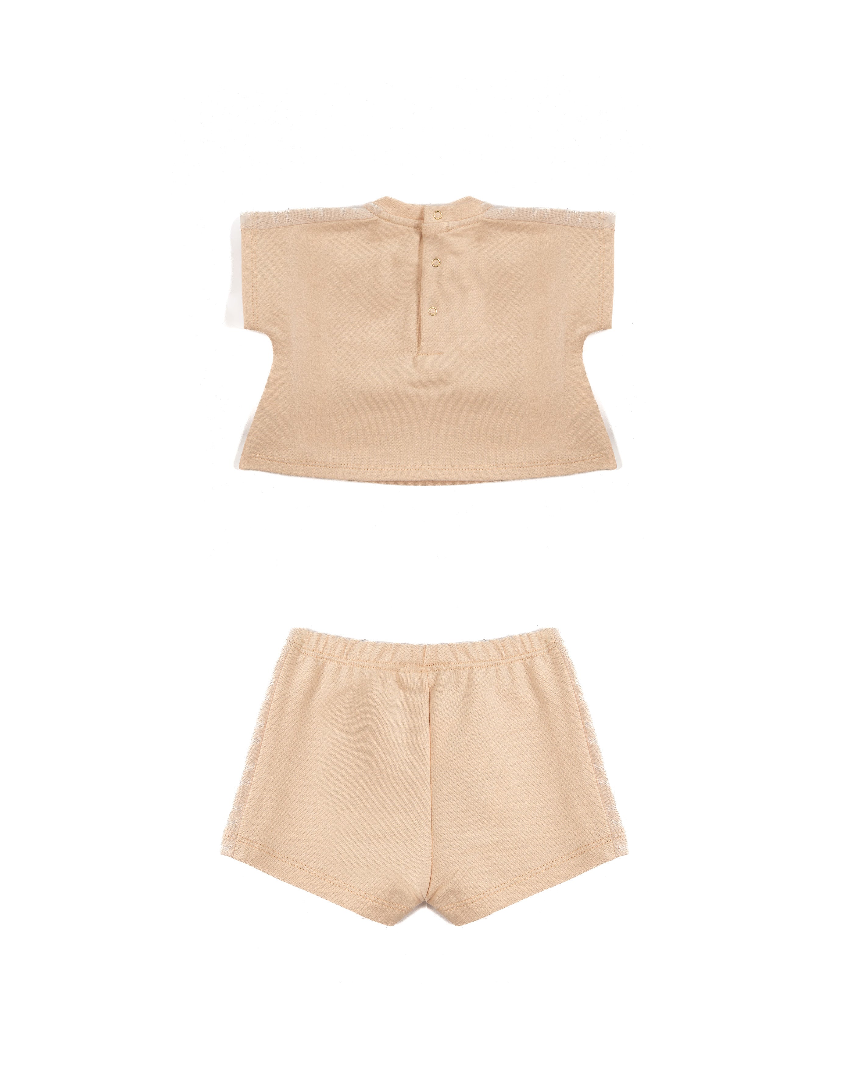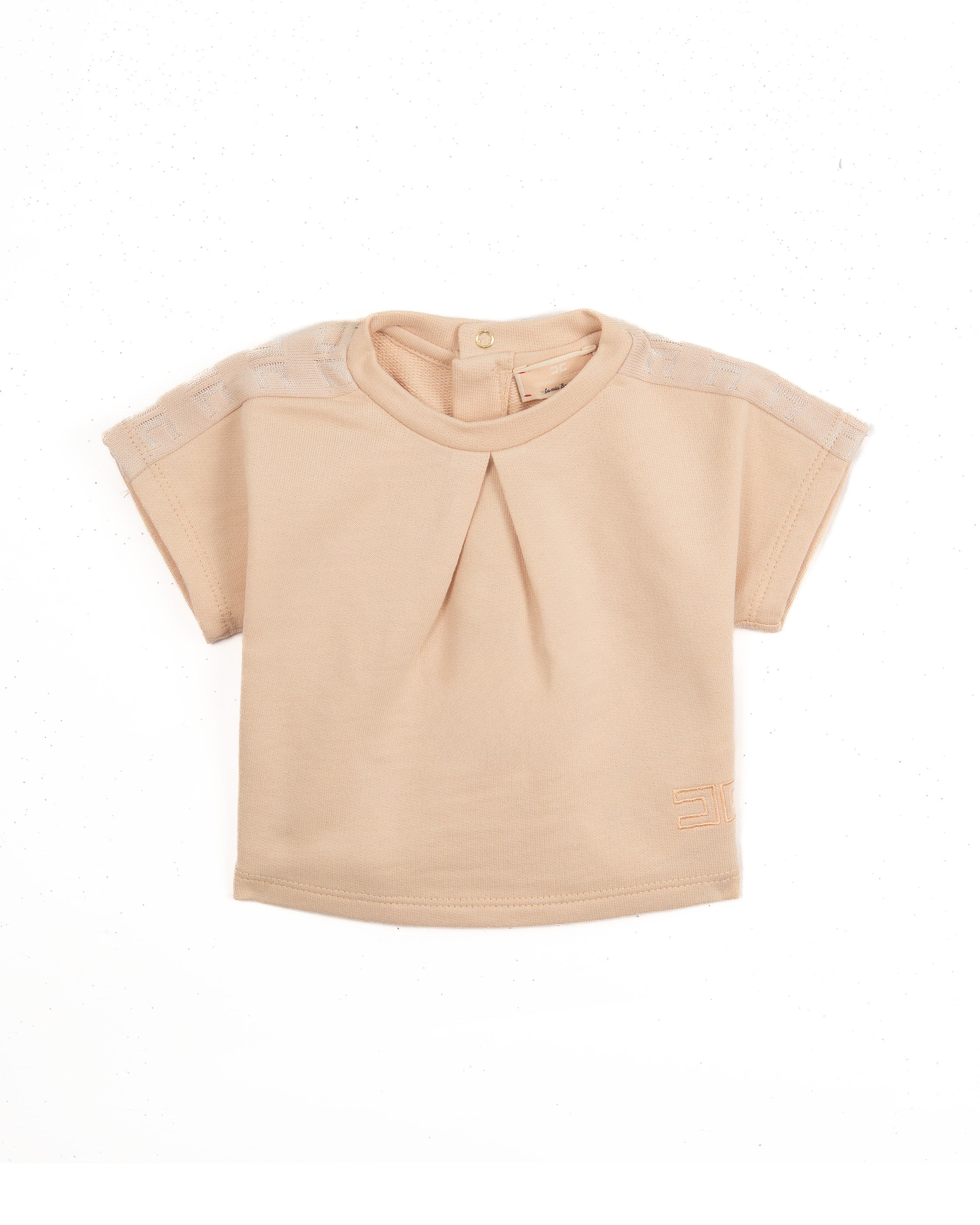 Set completo 2 pezzi per neonata firmato Elisabetta Franchi – La Mia Bambina, proposto in una delicata tonalità rosa. Il completo è composto da una t-shirt a manica corta con elegante piega frontale e logo EF tono su tono, abbinata a shorts coordinati con vita elasticizzata per garantire comfort e libertà di movimento.