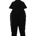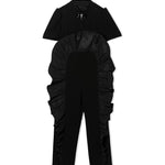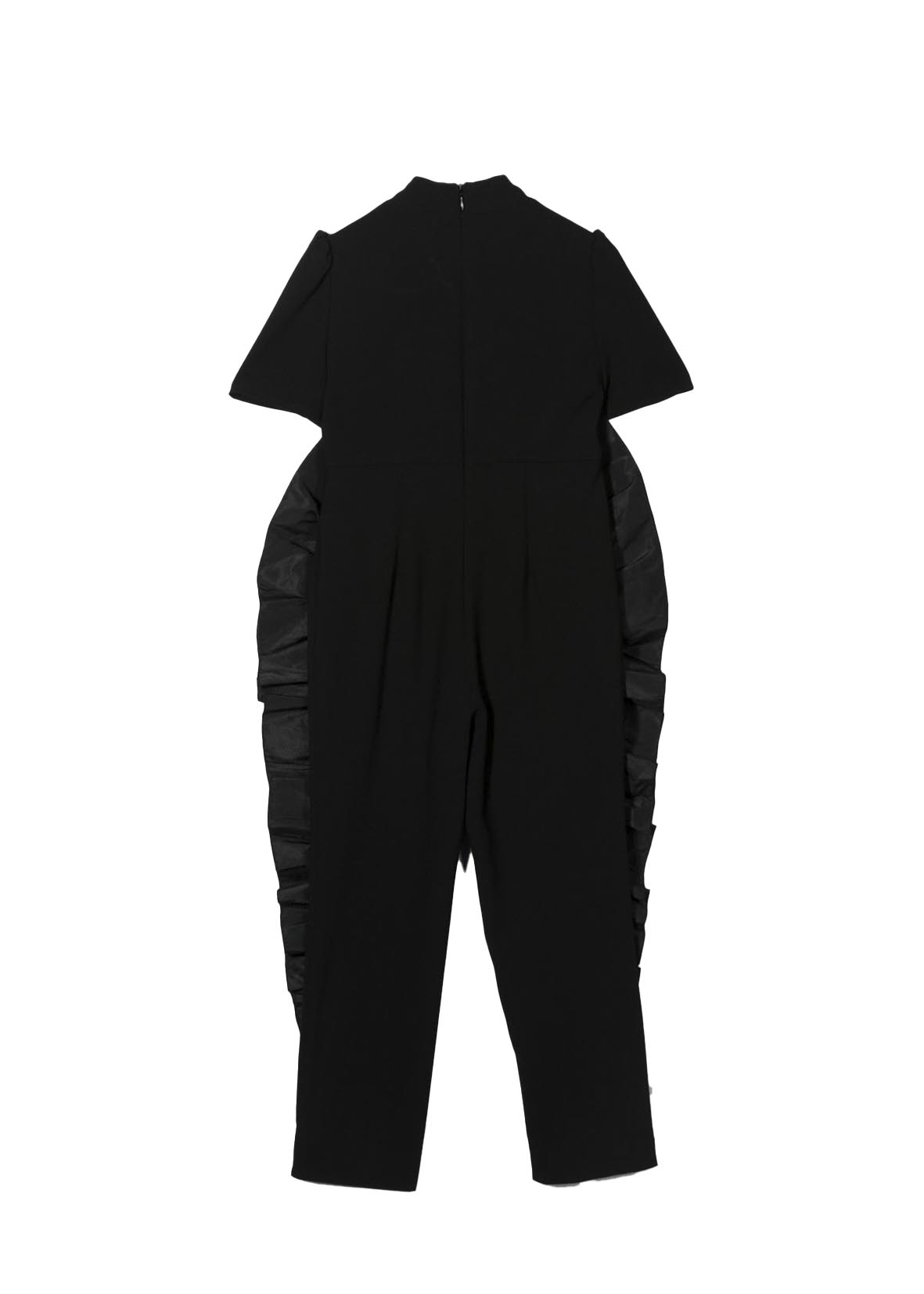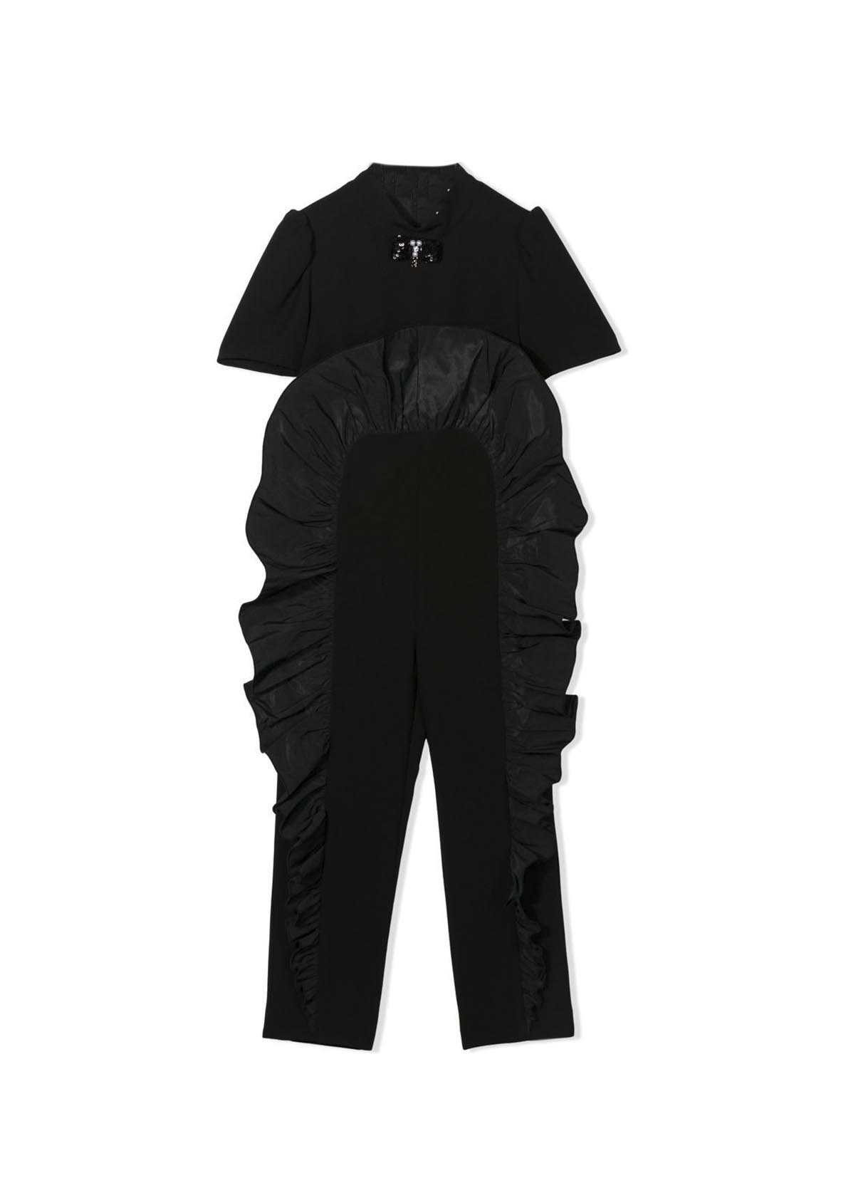 Tuta intera, dettaglio fiocco, dettaglio con ruches, collo a lupetto, maniche corte, chiusura posteriore con zip e taglio straight. Composizione Fodera: Viscosa 67%, Poliestere 33% Esterno: Poliestere 100%