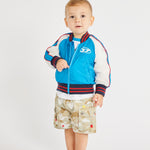 Giubbino Diesel Kids per neonati dal design sportivo e contemporaneo, perfetto per la mezza stagione. Il modello presenta una combinazione cromatica multicolor con corpo azzurro brillante, maniche a contrasto e dettagli rigati su collo, polsini e fondo che richiamano lo stile varsity.