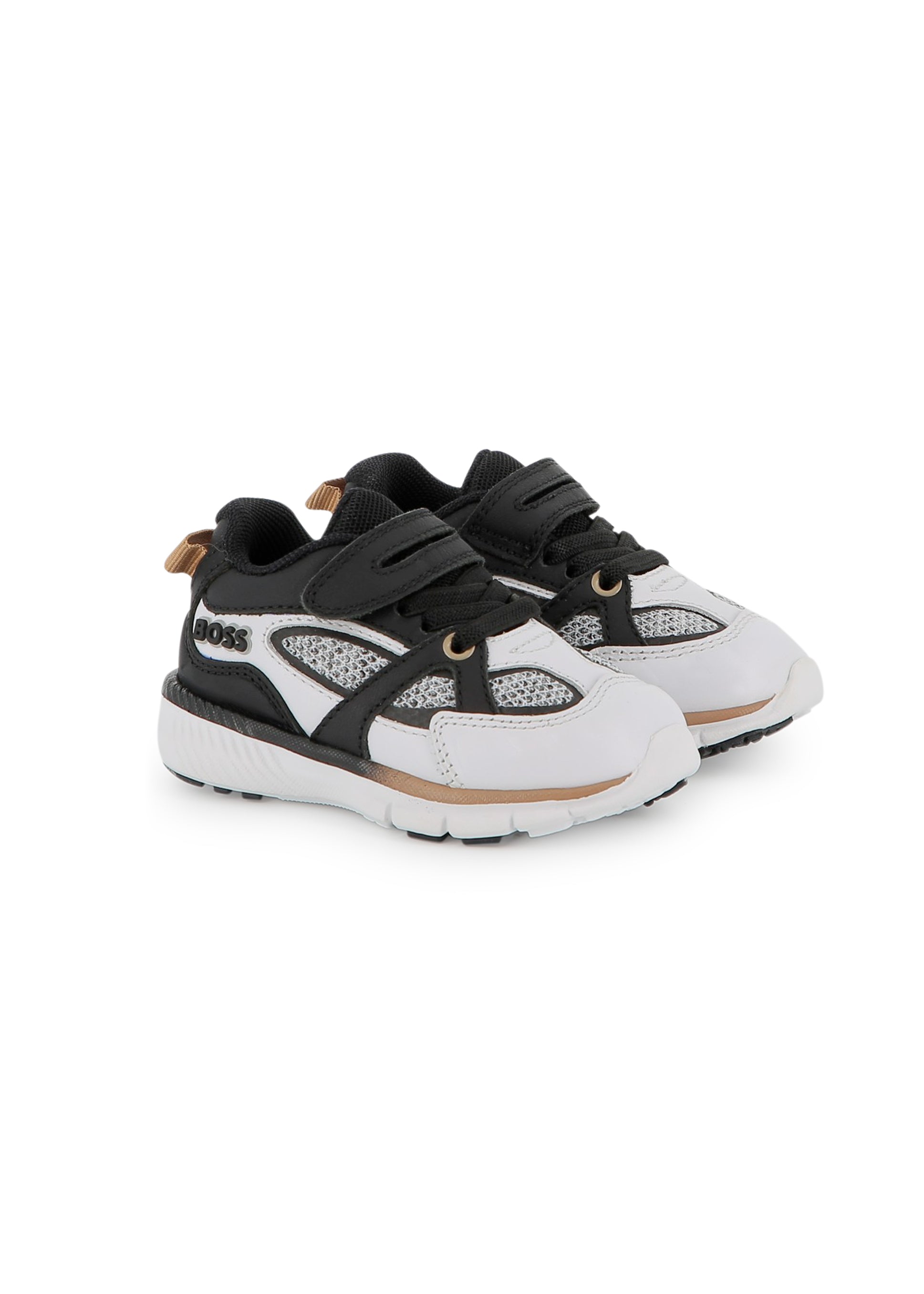 Le BOSS Kids sneakers bianco e nero con strappo per neonati uniscono praticità e stile inconfondibile firmato Hugo Boss. Realizzate in pelle sintetica di alta qualità, presentano un design moderno con chiusura a strappo e finti lacci per una calzata facile e sicura. Il contrasto cromatico bianco e nero dona al modello un look elegante e versatile, perfetto per completare outfit casual o più raffinati. La suola flessibile e leggera assicura massimo comfort ai primi passi del tuo bambino.