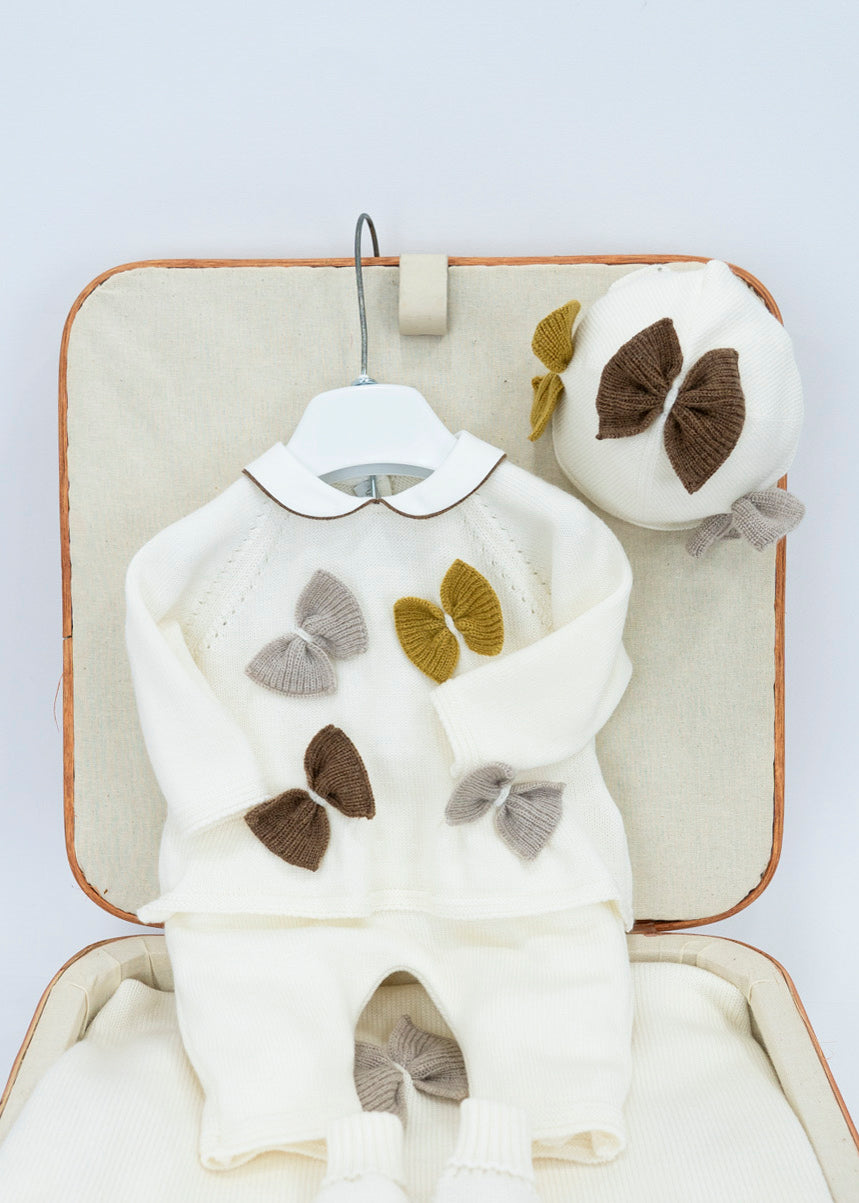 Il completo bianco in lana per neonati di Le Coconne è un capo elegante e morbido, perfetto per i più piccoli. Con fiocchi applicati in colori tenui come marroncino e ocra, aggiunge un tocco di dolcezza e raffinatezza al look. Il colletto Peter Pan con bordo a contrasto dona un dettaglio chic, mentre la morbida lana mantiene il bambino caldo e comodo. Parte di un delizioso corredino, questo completo è l'ideale per ogni occasione speciale o per l'uso quotidiano.