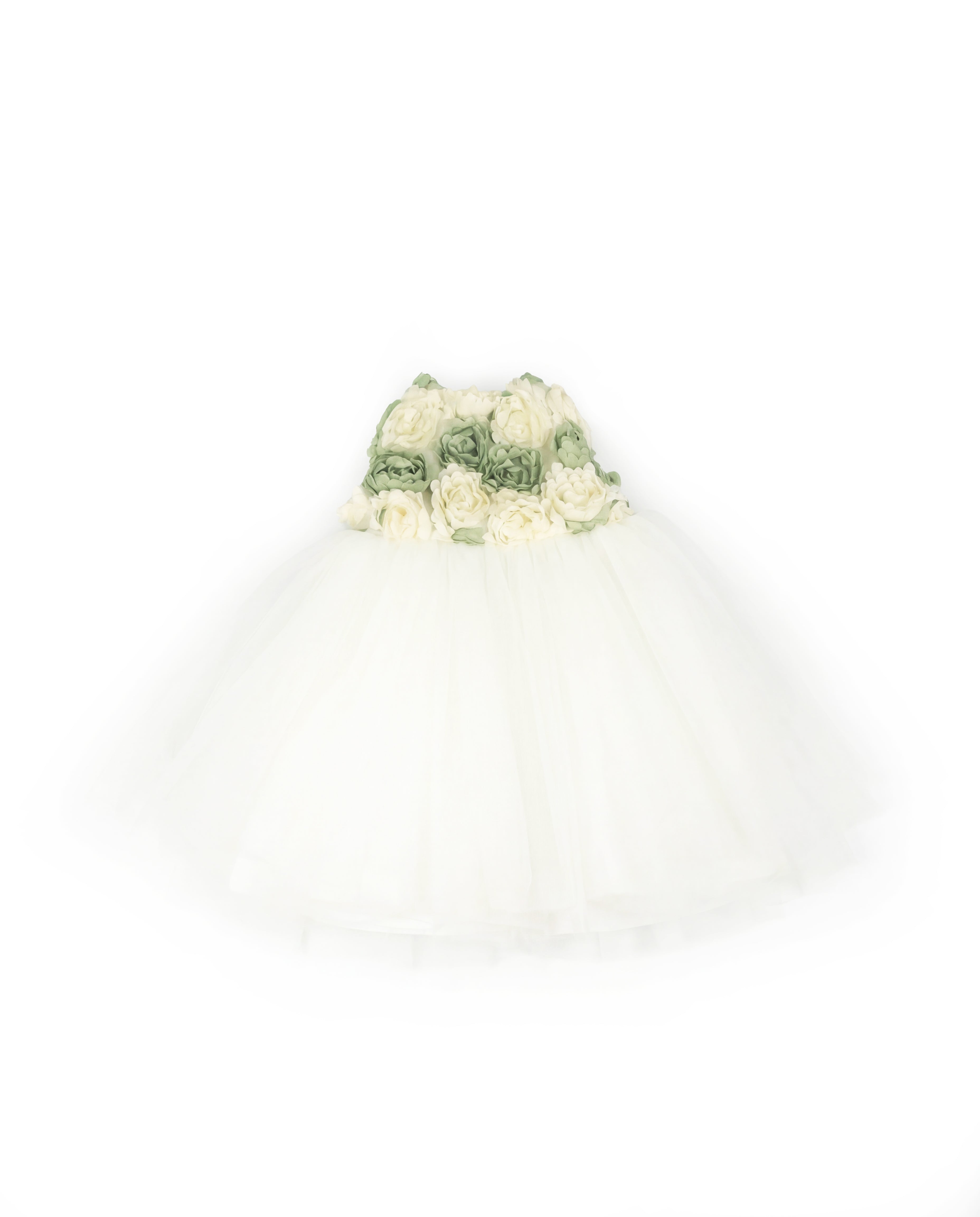 Il corpetto smanicato è impreziosito da teneri petali applicati che creano un effetto tridimensionale romantico e ricercato. La lavorazione in tulle italiano valorizza l’artigianalità del capo, mentre l’accostamento tra vaniglia e verde salvia richiama la freschezza della primavera e l’armonia della natura.