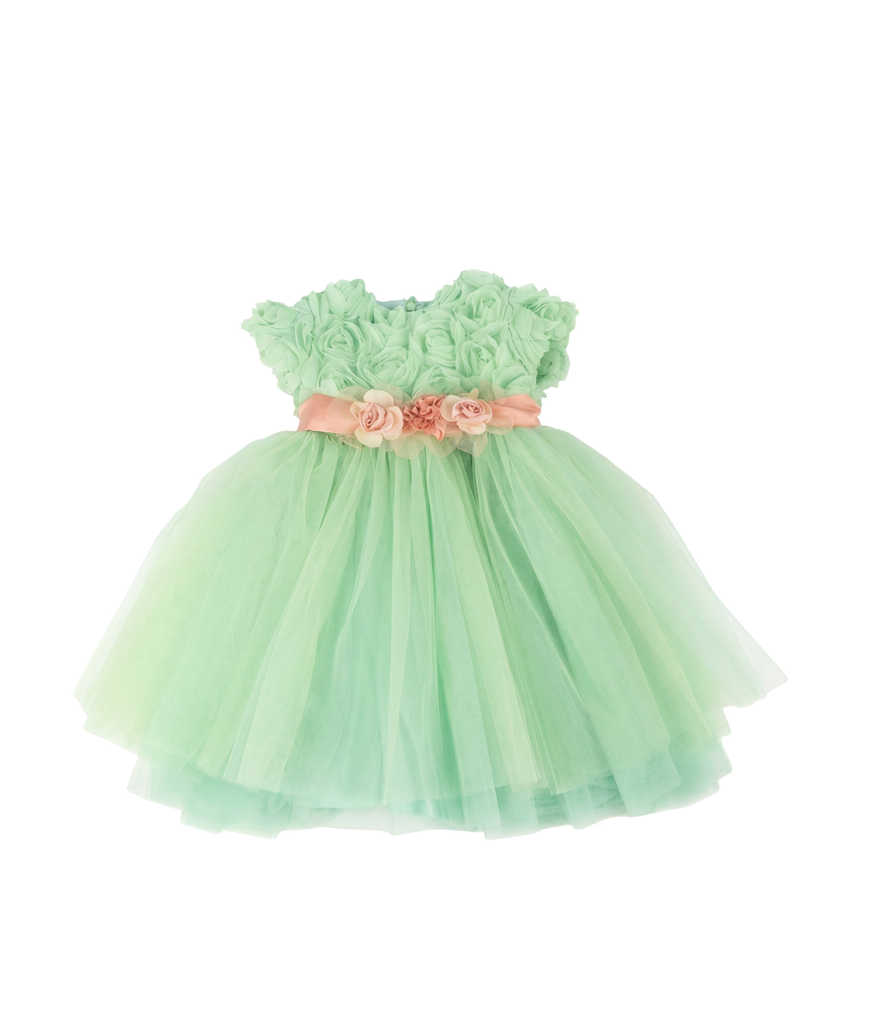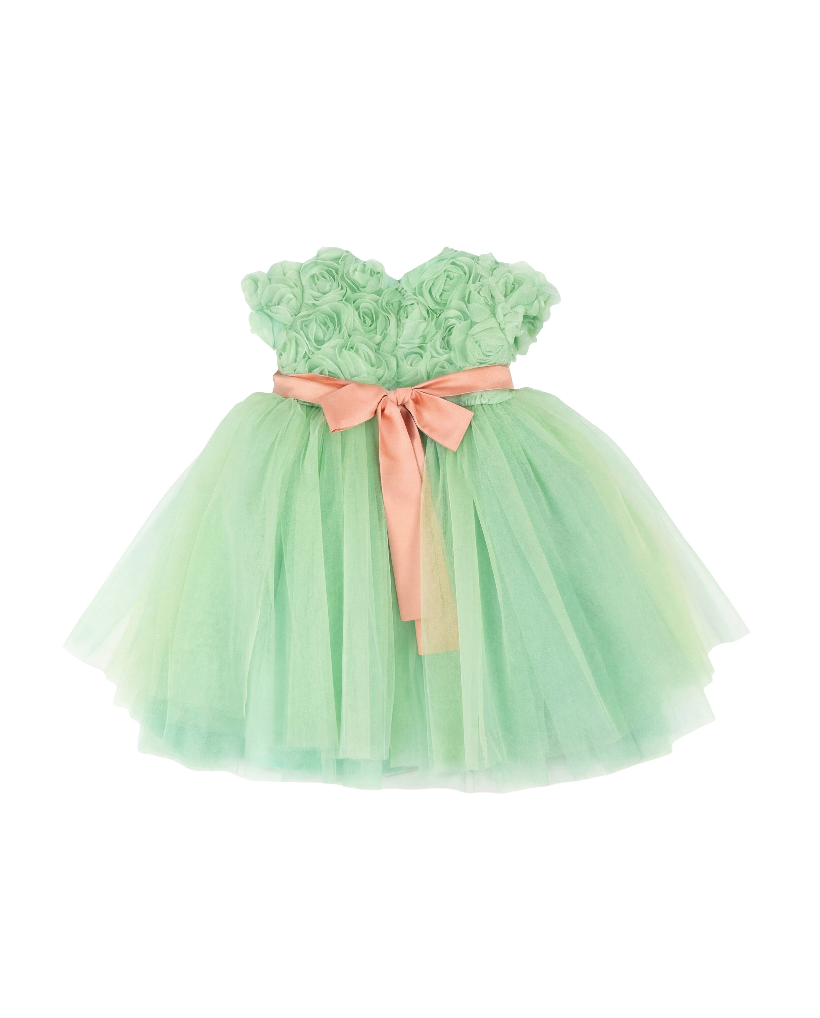 La tonalità verde marsala esprime freschezza e armonia, mentre la cintura in contrasto con piccoli fiori applicati valorizza il punto vita con un dettaglio elegante. La gonna ampia in tulle stratificato aggiunge leggerezza e movimento, creando una silhouette vaporosa e fiabesca.