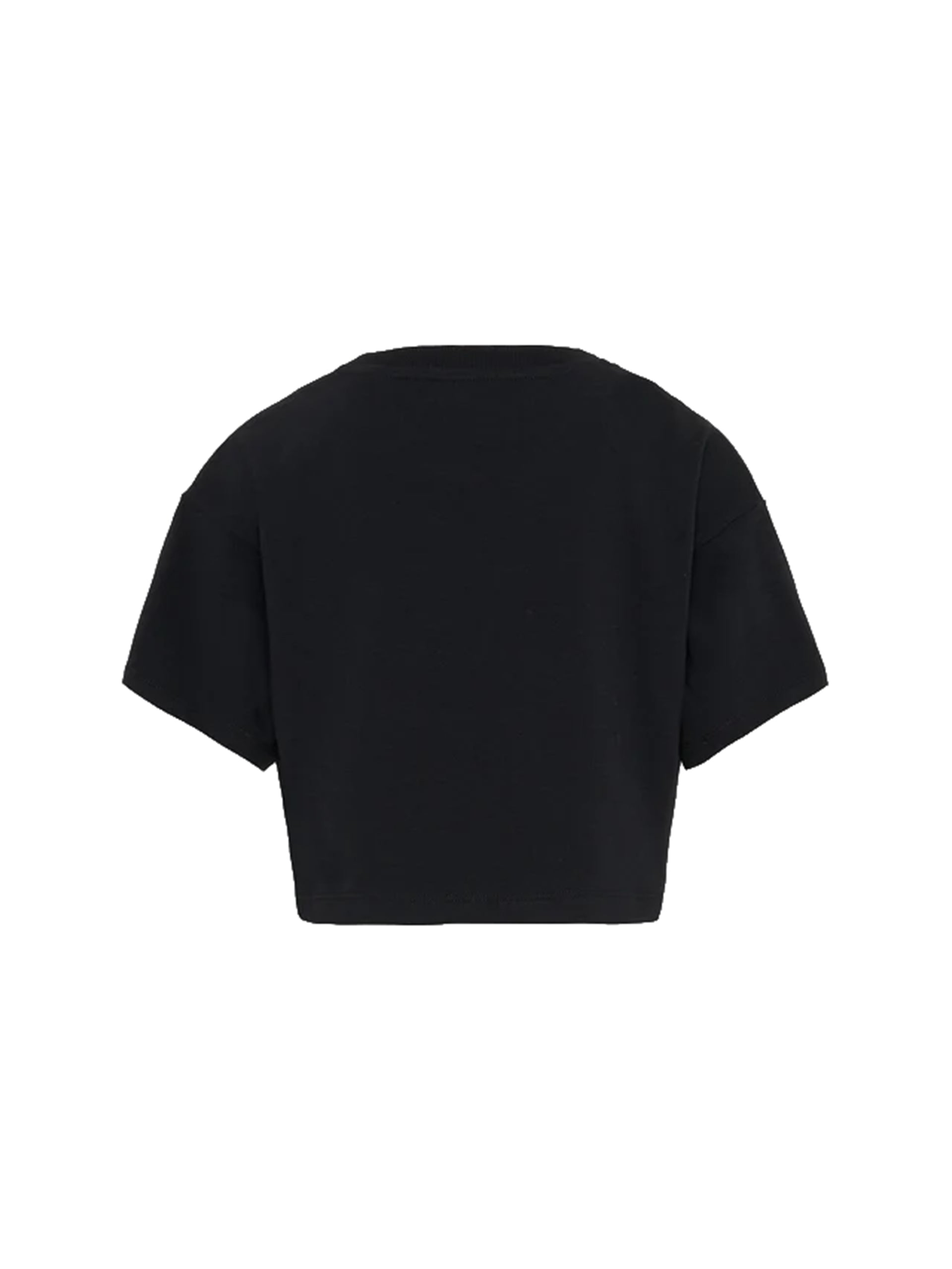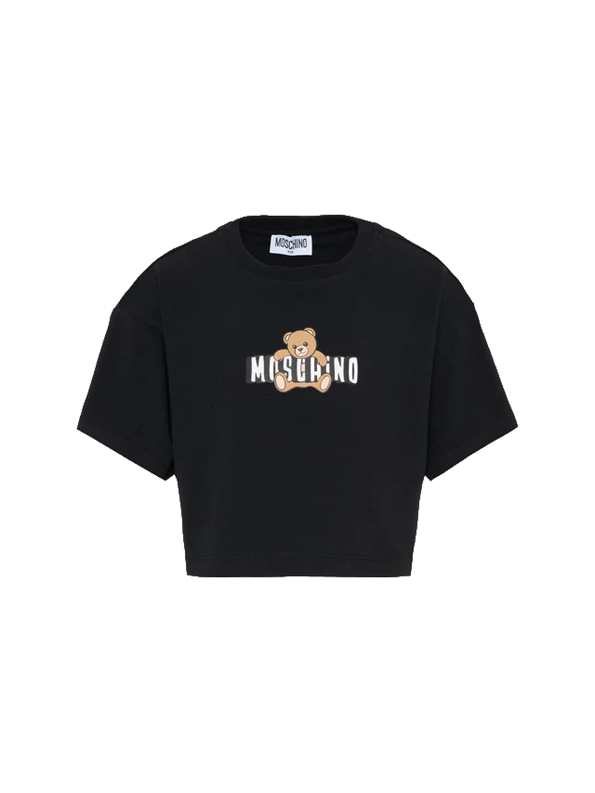 T-shirt Moschino Kids in jersey di cotone nero, caratterizzata da linea cropped e vestibilità contemporanea. Il modello presenta girocollo rifinito a costine e maniche corte leggermente ampie, per un volume moderno e confortevole.