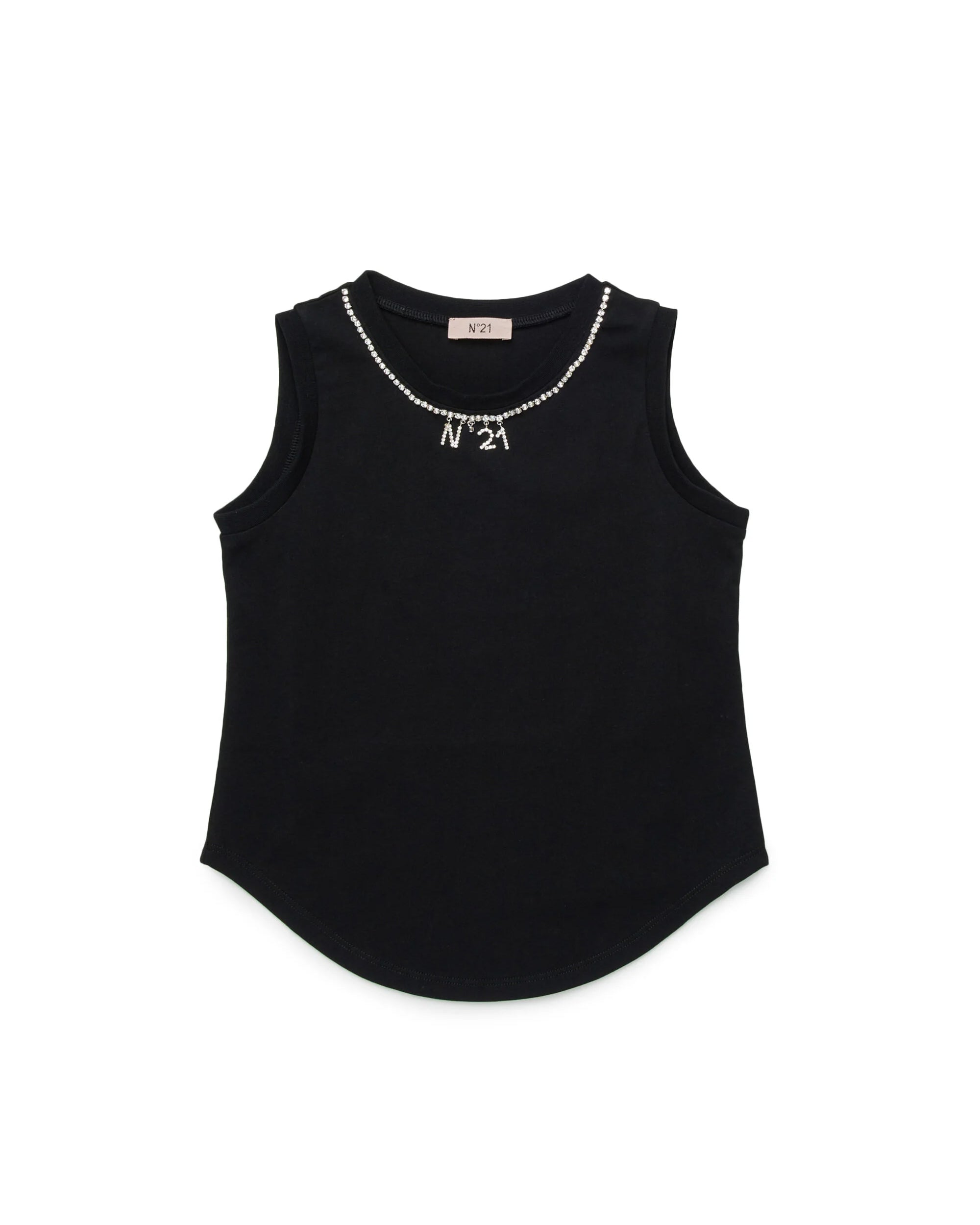 N21 Kids Canotta Nera con Dettagli Strass e Logo per Bambine
