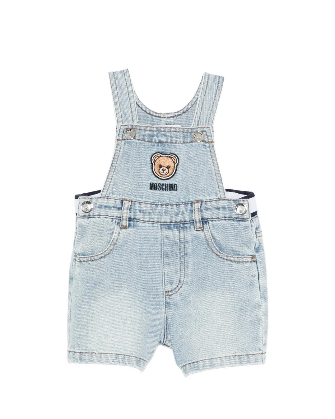 Salopette Moschino Kids in denim chiaro dal design iconico e contemporaneo, impreziosita dal ricamo Teddy Bear con logo sul petto. Un capo dallo stile riconoscibile che unisce estetica e praticità, pensato per accompagnare le più piccole con comfort e carattere.