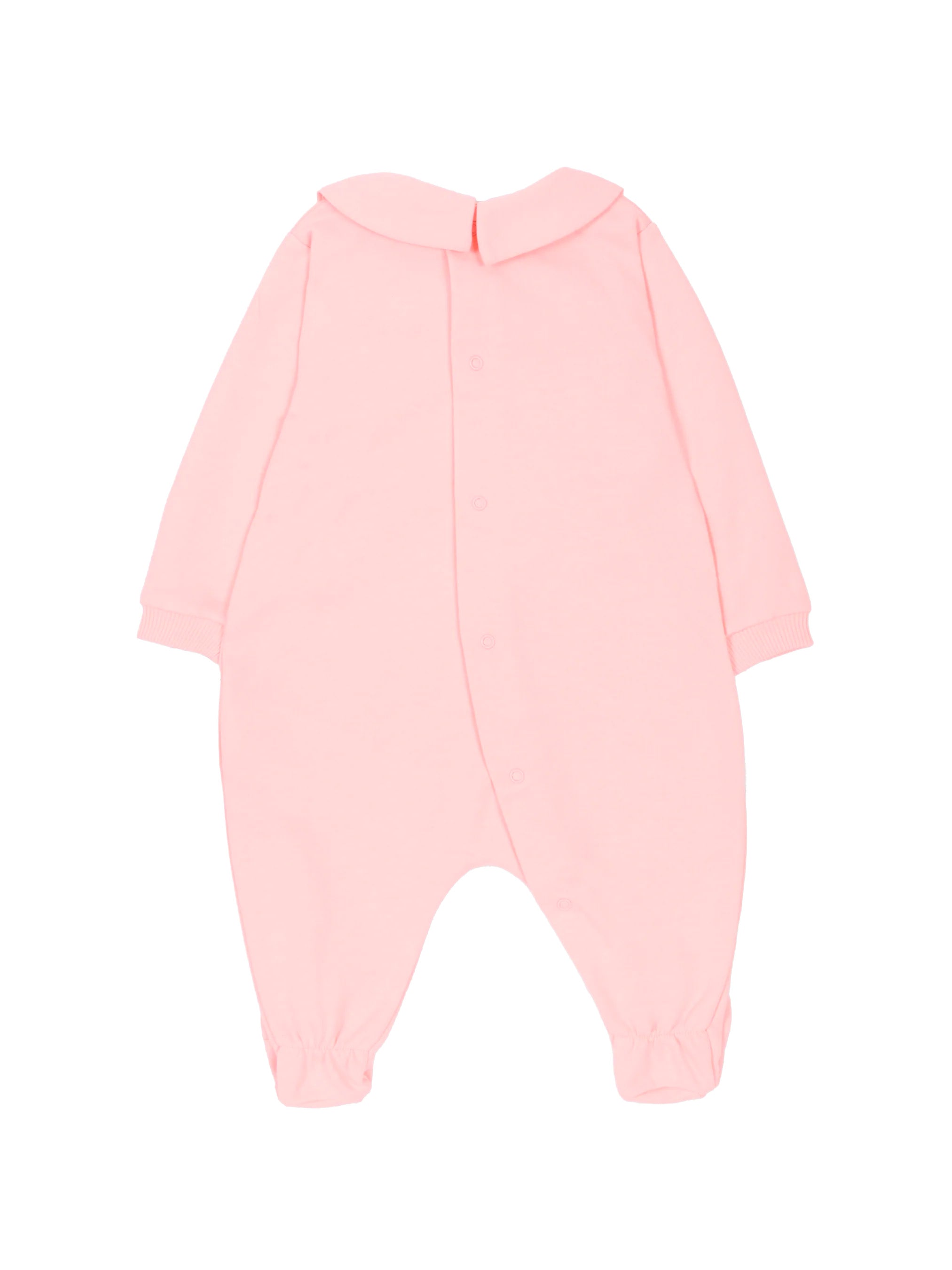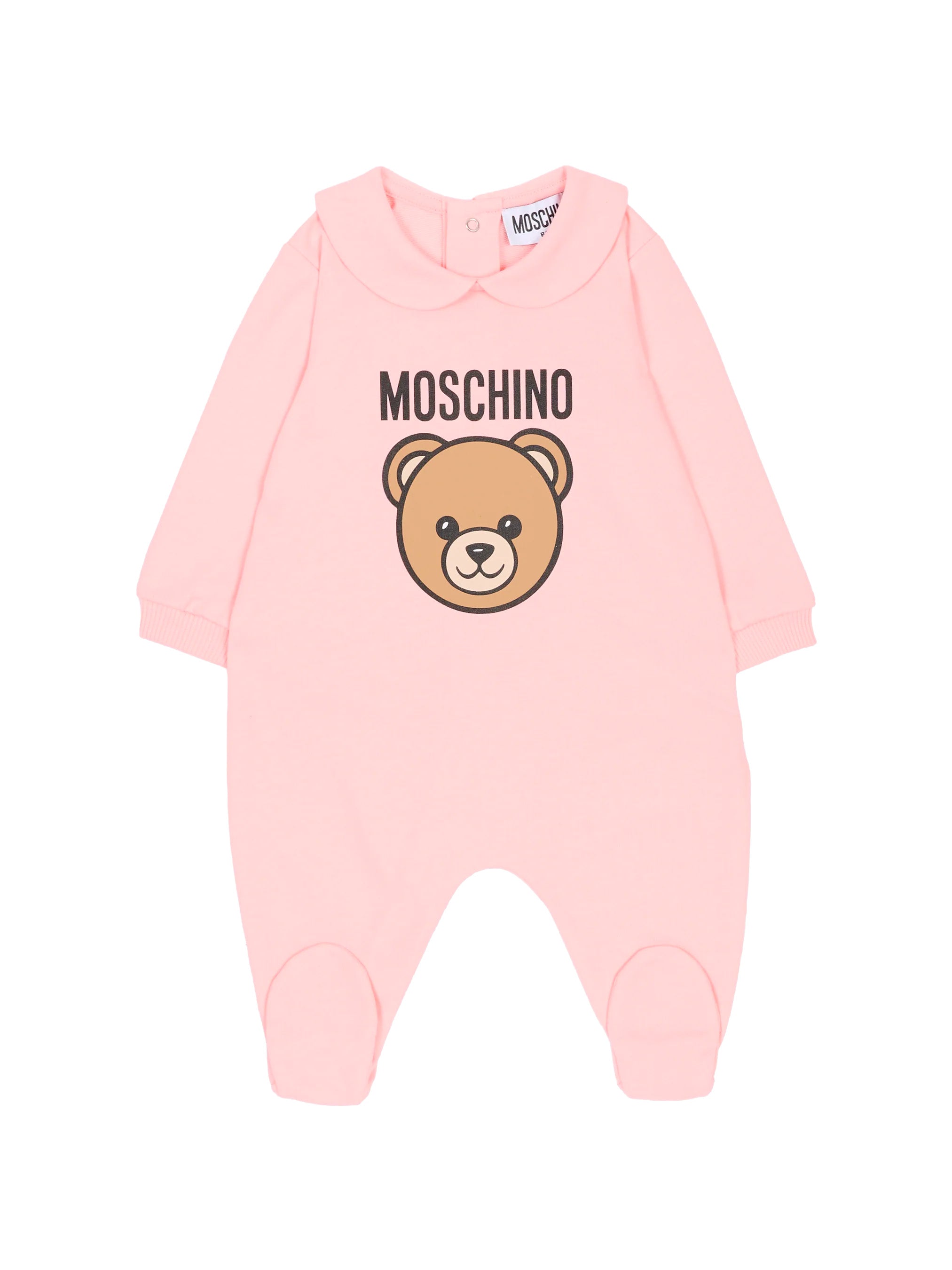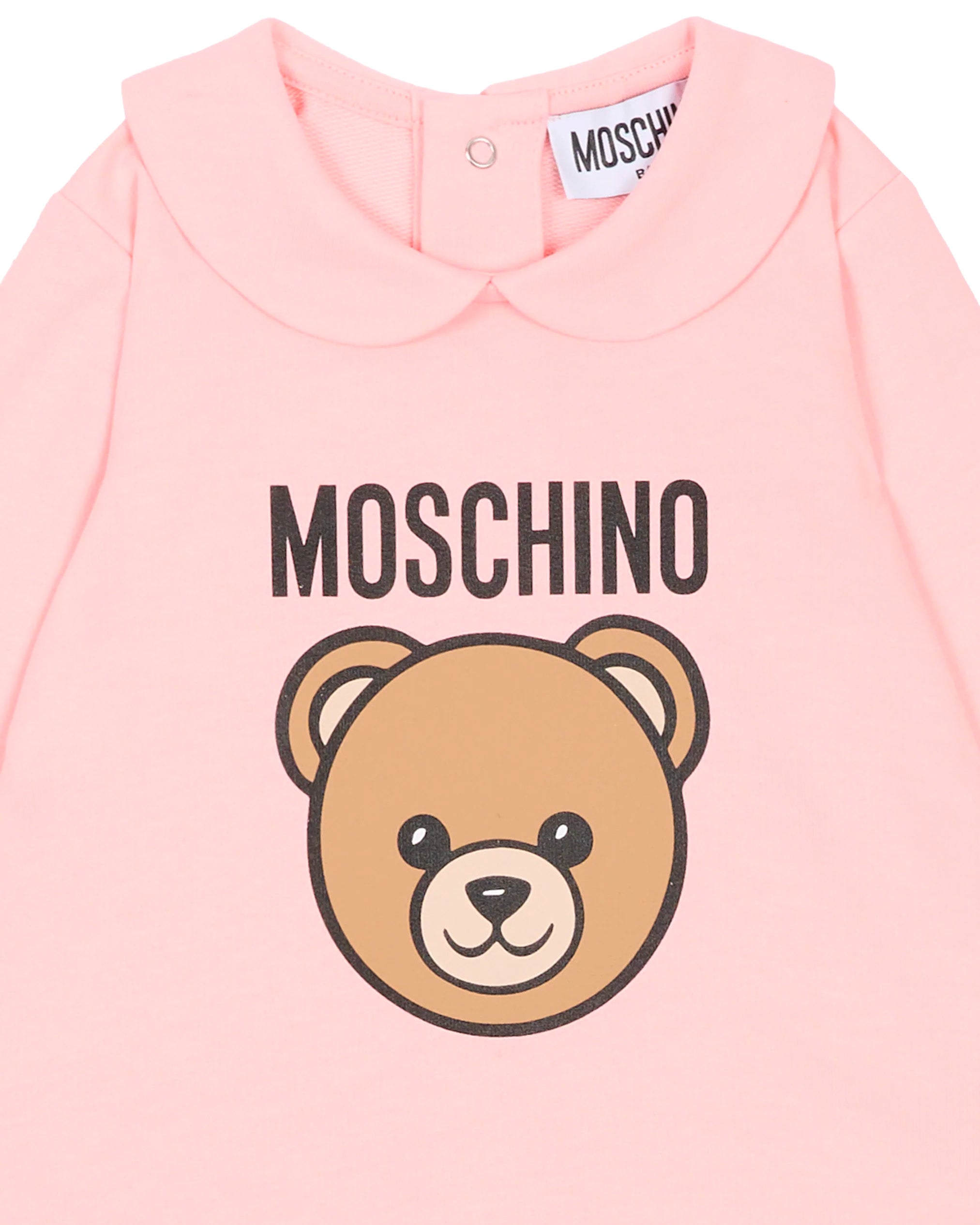 Tutina Moschino Baby realizzata in morbido cotone elasticizzato, pensata per garantire massimo comfort e libertà di movimento ai più piccoli. Il delicato colore rosa è valorizzato dall’inconfondibile Teddy Bear Moschino con logo a contrasto sul davanti, simbolo di stile e ironia del brand.