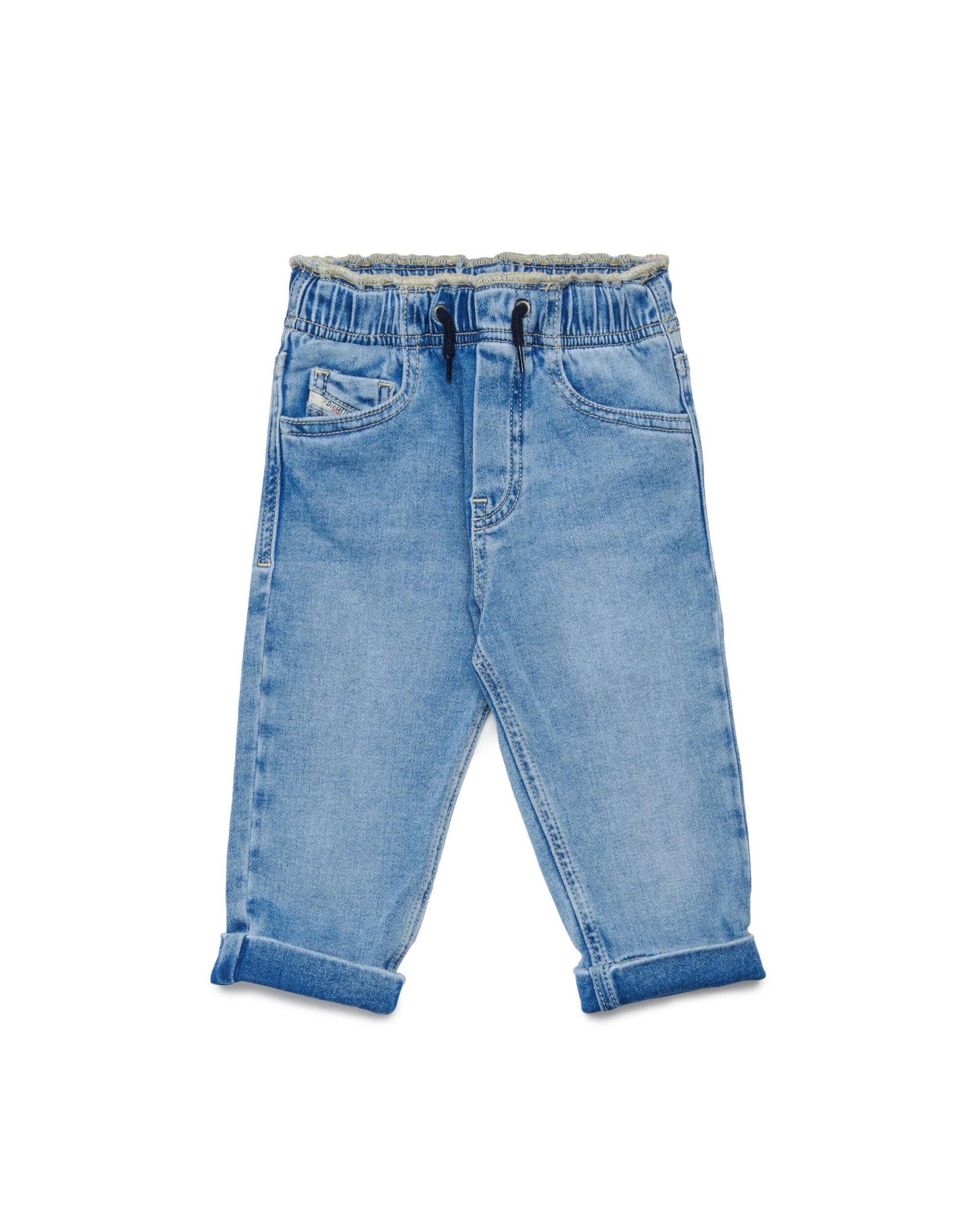 Jeans Diesel Kids JoggJeans® per neonati realizzati in denim elasticizzato dal comfort tipico della felpa. Il modello presenta un lavaggio azzurro chiaro, vita elasticizzata con coulisse e una vestibilità relaxed/boyfriend, ideale per accompagnare i movimenti quotidiani dei più piccoli con stile e praticità.