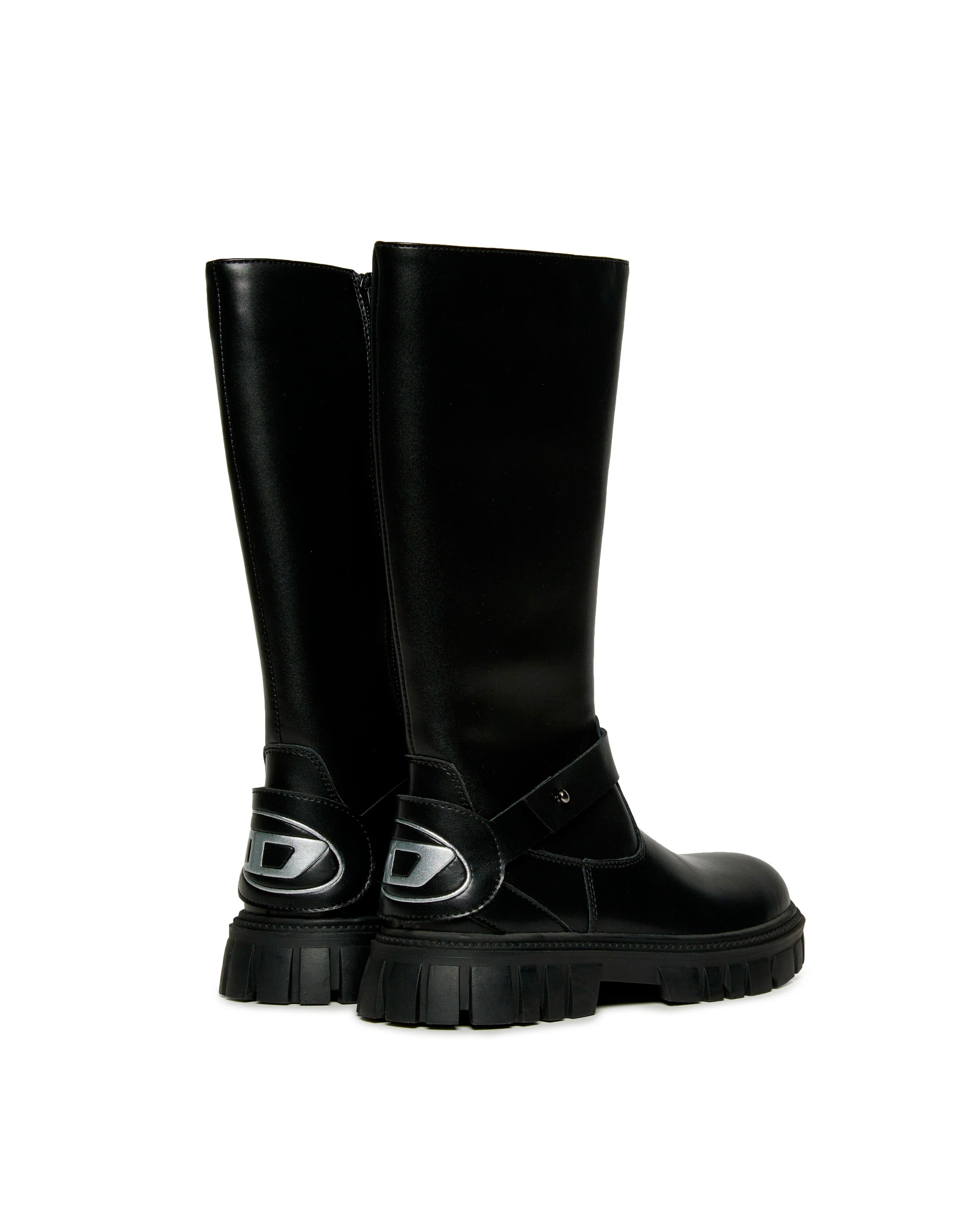 Gli stivali neri lucidi Diesel Kids sono un accessorio iconico che unisce carattere e funzionalità. Realizzati in pelle di alta qualità, presentano una silhouette robusta e moderna, perfetta per dare personalità agli outfit delle più piccole.