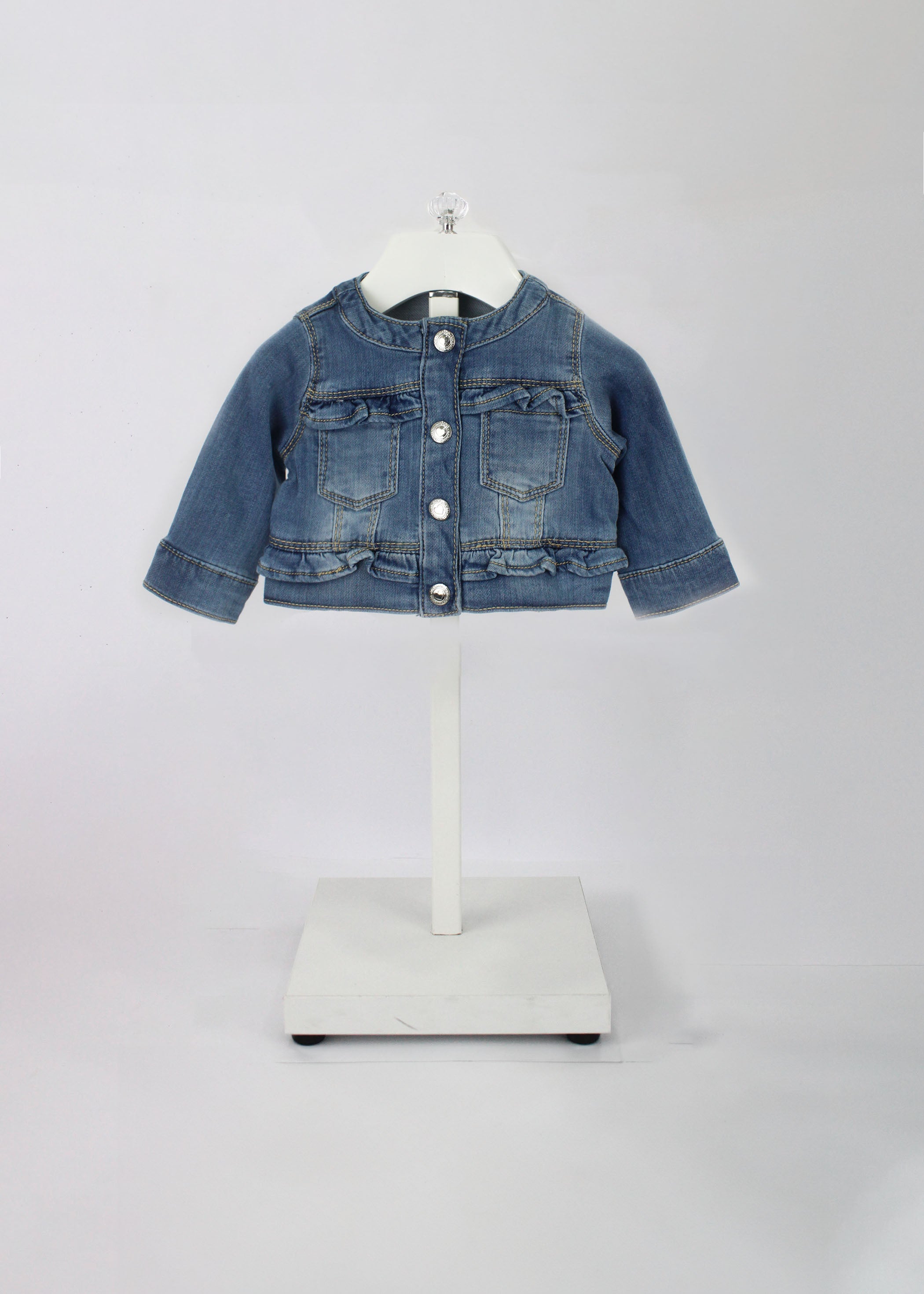 Giubbino Minibanda per neonata realizzato in morbido denim di maglia stretch in cotone, pensato per offrire il massimo comfort e libertà di movimento senza rinunciare allo stile. Il modello presenta un’elegante apertura frontale con bottoni e un raffinato collo alla coreana, per un look moderno e femminile. Le tasche laterali sono arricchite da delicate ruches che aggiungono un tocco romantico e curato nei dettagli. Versatile e comodo, questo giubbino è perfetto per la mezza stagione e si abbina facilmente a qualsiasi outfit, completando con gusto i look casual e più eleganti della tua bambina.
