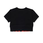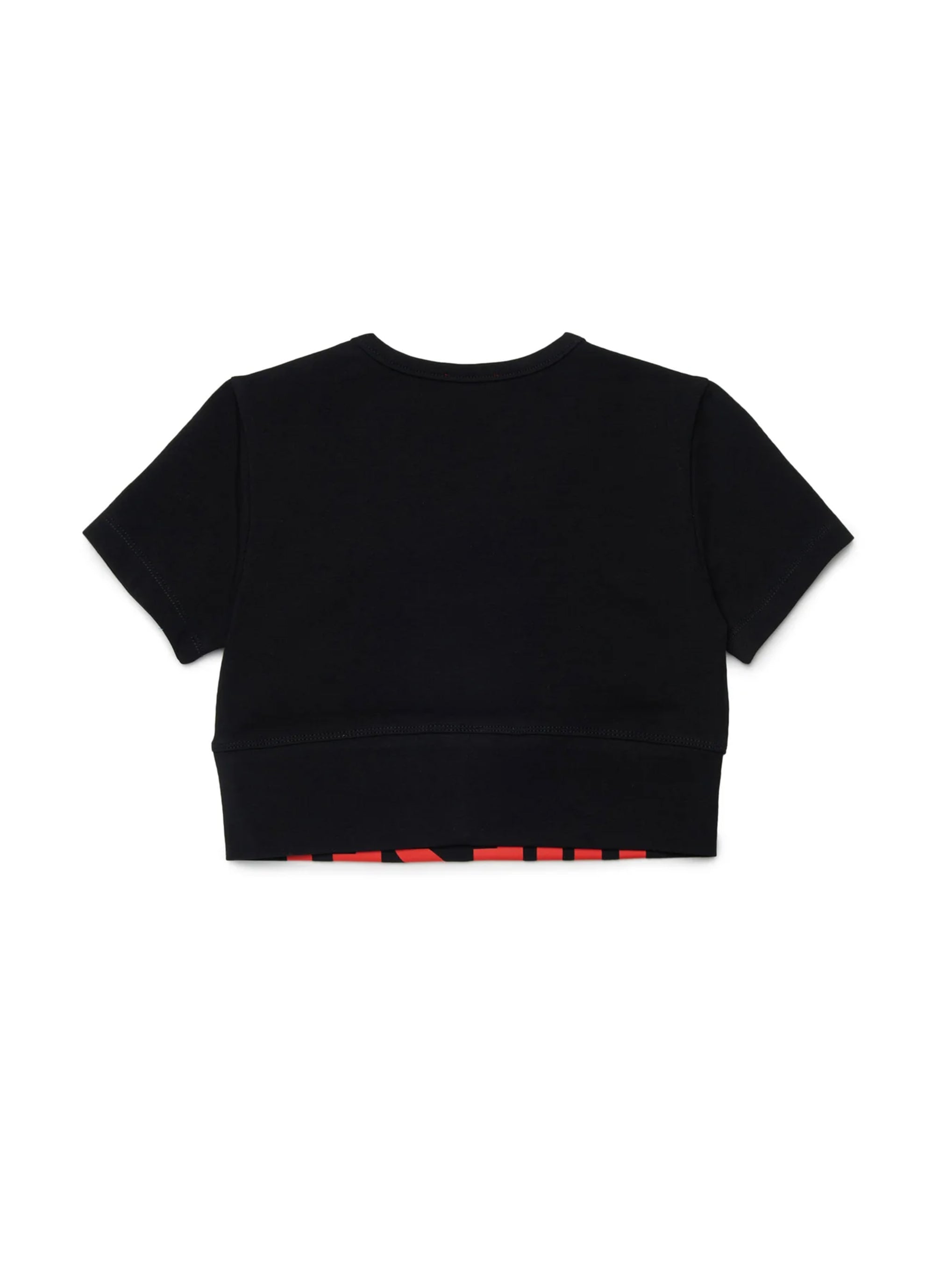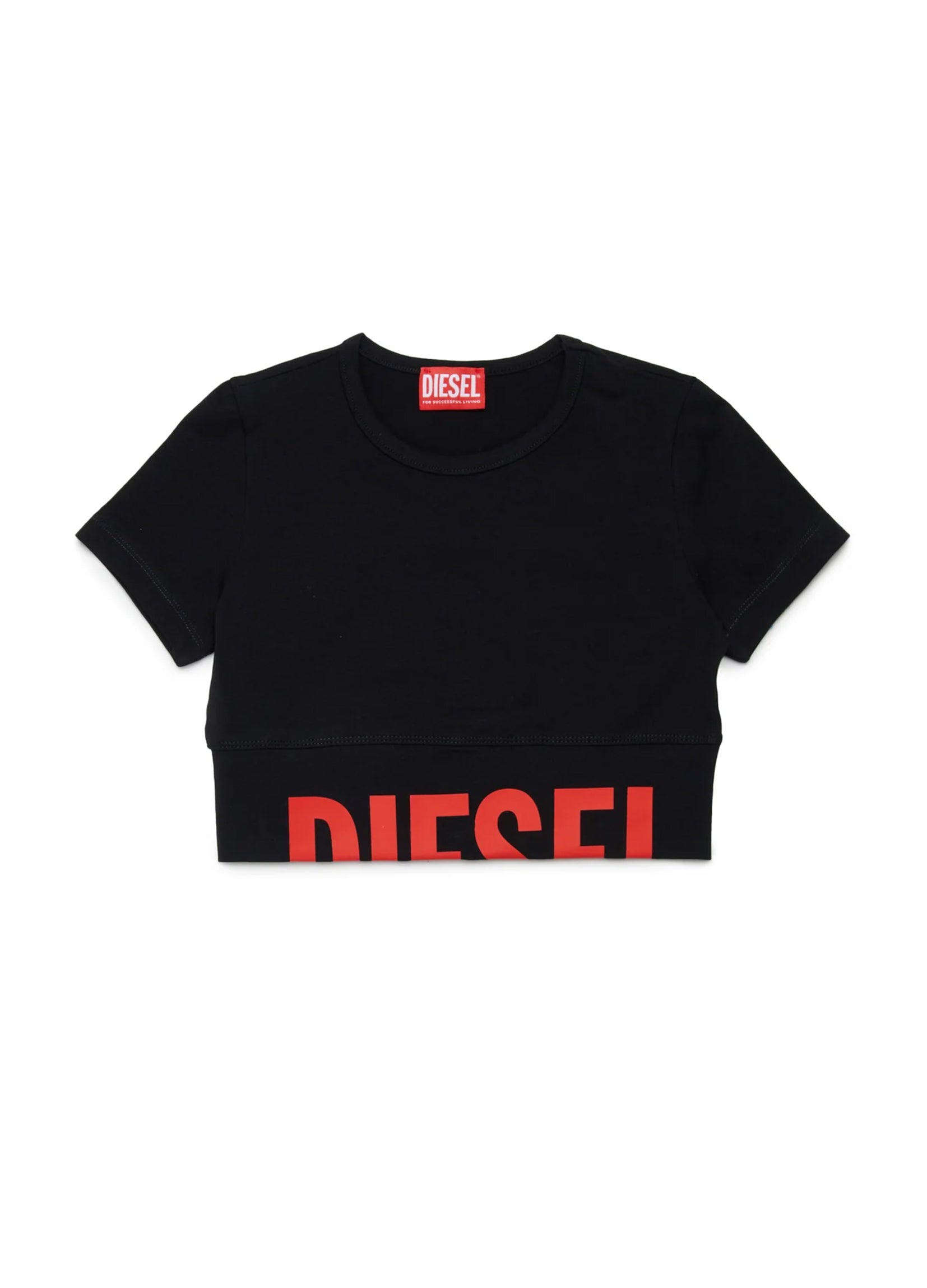 Il modello presenta taglio cropped con linea dritta, girocollo e maniche corte. Il dettaglio distintivo è la stampa del logo Diesel a contrasto sul fondo frontale, che dona carattere al capo e lo rende immediatamente riconoscibile.