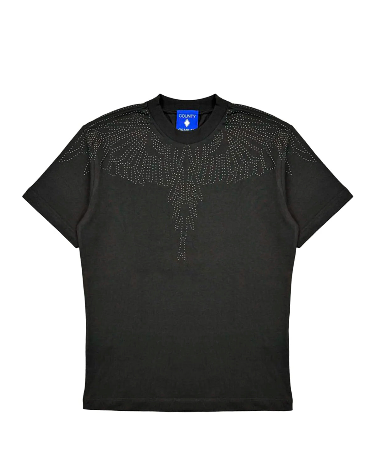 La Marcelo Burlon County of Milan Kids t-shirt nera con design in strass per bambine è un capo iconico che unisce lo stile urban del brand a un tocco glamour. Realizzata in 100% cotone, presenta una vestibilità regolare con girocollo a costine e maniche corte per il massimo comfort.