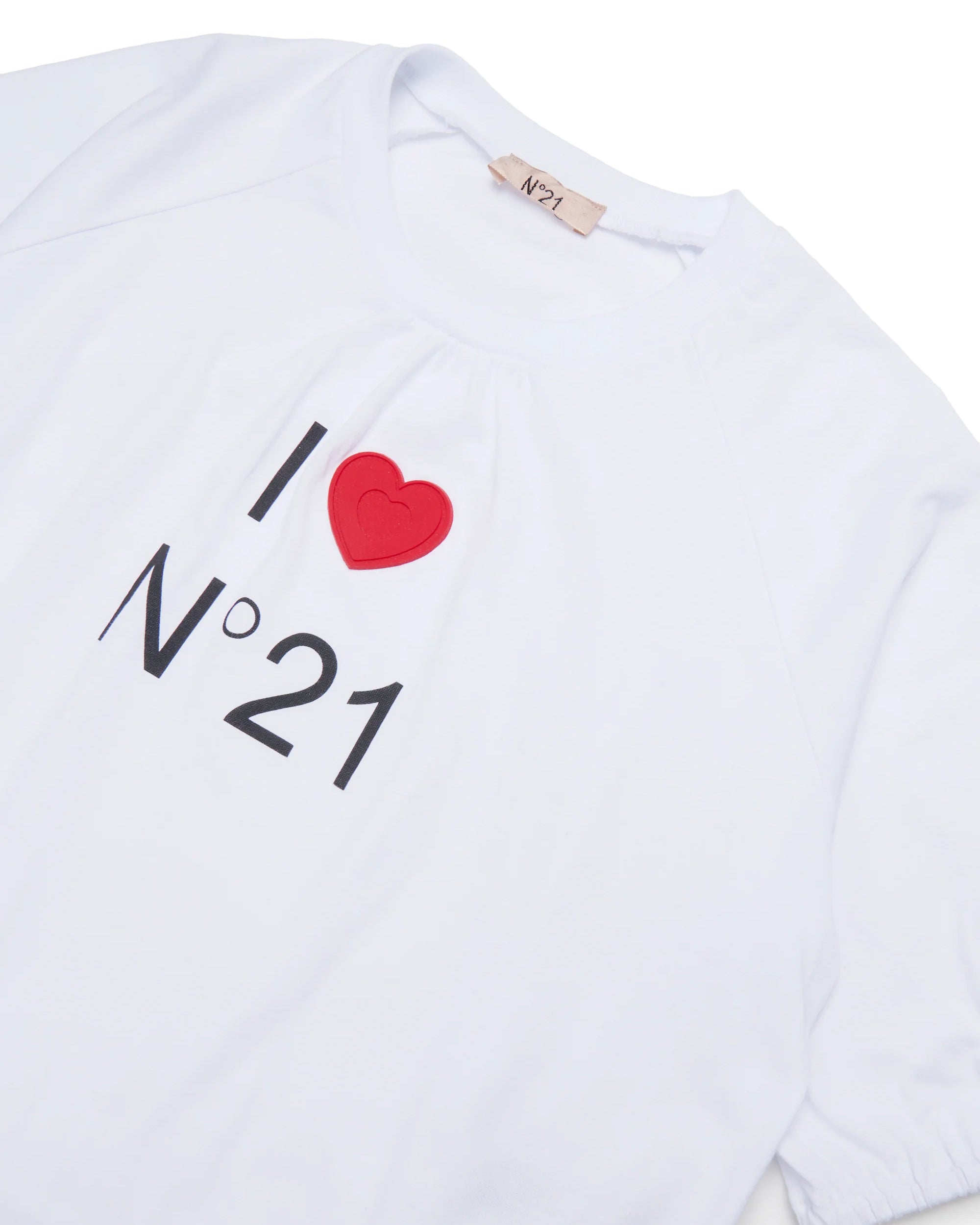 T-shirt in cotone bianco firmata N°21, caratterizzata dall’iconica stampa frontale “I ♥ N°21” che dona un tocco ironico e contemporaneo al capo. Il design presenta maniche corte e una vestibilità morbida valorizzata dal fondo arricciato, che crea un elegante effetto balloon. Un modello versatile, ideale da abbinare sia a look casual che più ricercati, perfetto per esprimere stile e personalità fin da piccoli.