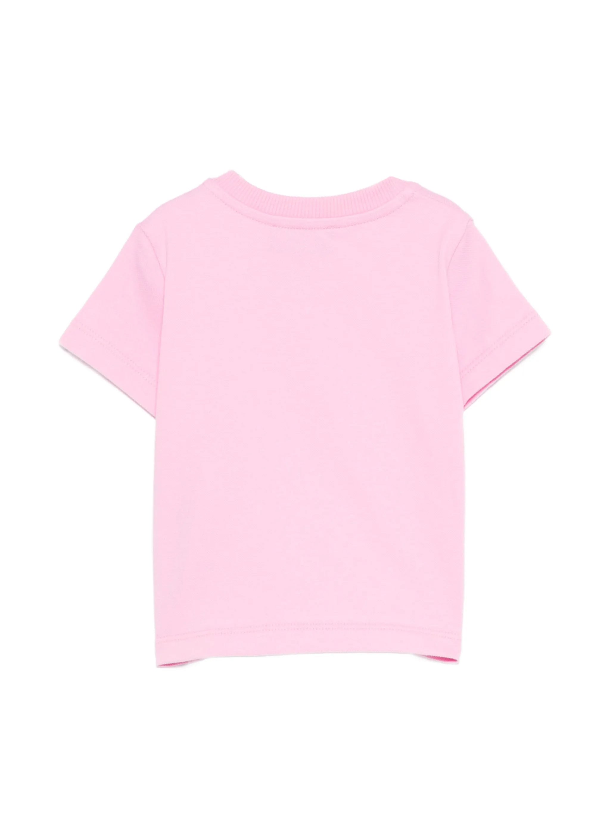 T-shirt Moschino Kids per neonate in delicata tonalità rosa, caratterizzata da maxi logo Teddy Bear stampato sul davanti per un tocco iconico e fashion. Il capo presenta colletto con abbottonatura a pressione, girocollo e maniche corte, con orlo dritto per una linea semplice ma d’impatto.