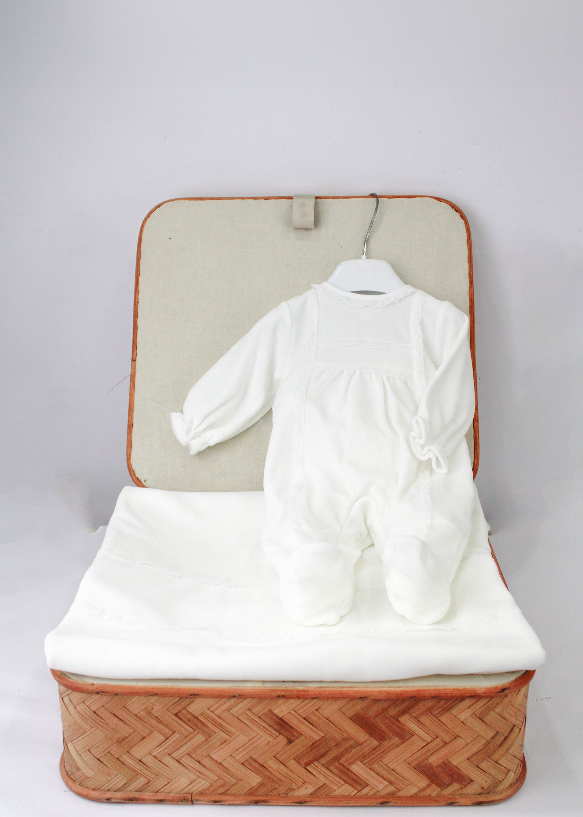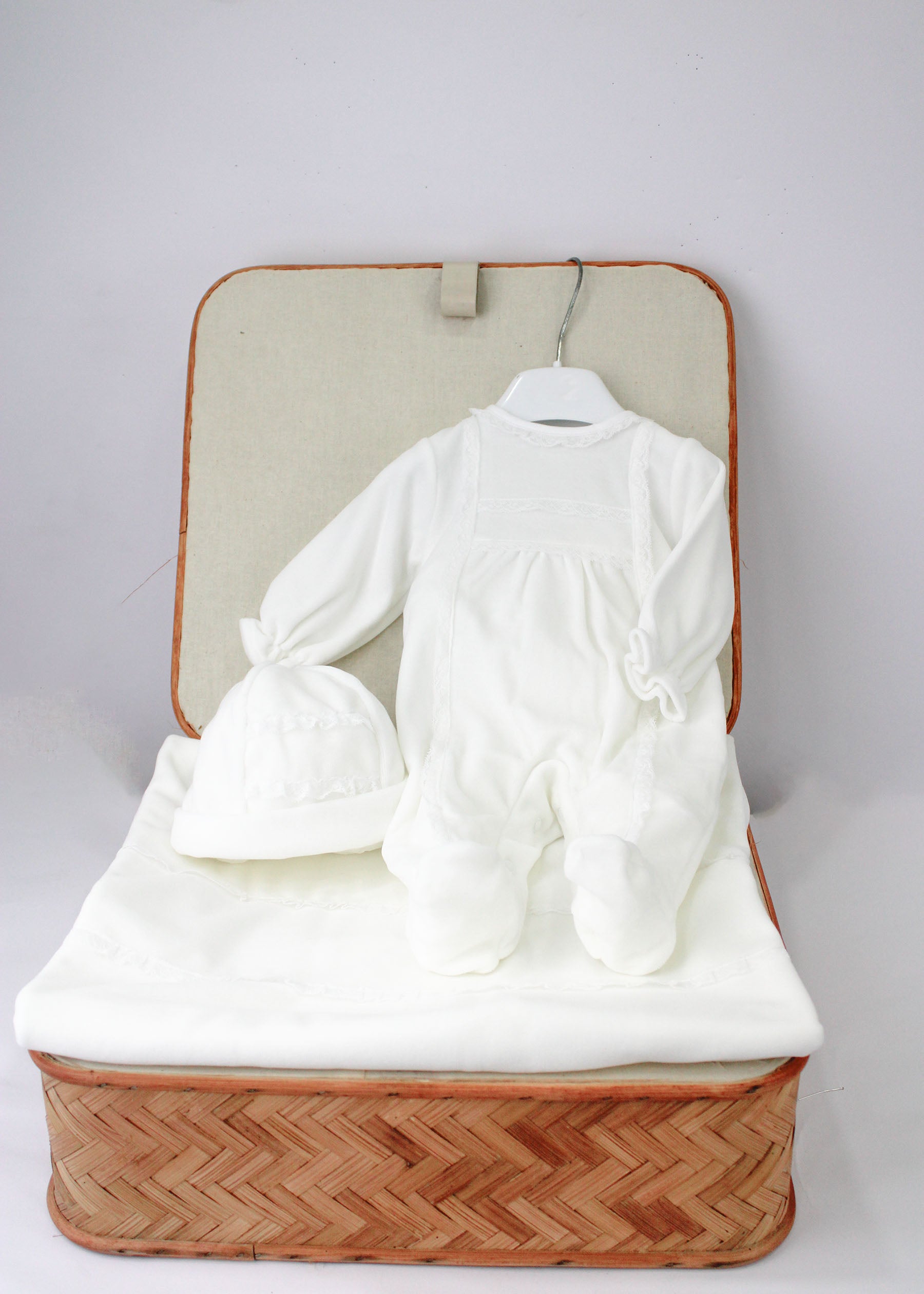 Il completo Deolinda avorio per neonate è un set raffinato e delicato che comprende una tutina, un cappellino e una coperta, tutti coordinati con graziosi ricami. La tutina in ciniglia è adornata con ricami sul petto, che si ripetono nel cappellino e nella coperta, creando un look armonioso e affettuoso. Realizzato con materiali morbidi e di alta qualità, questo completo è ideale per avvolgere il tuo piccolo in un caldo abbraccio, unendo comfort e stile.