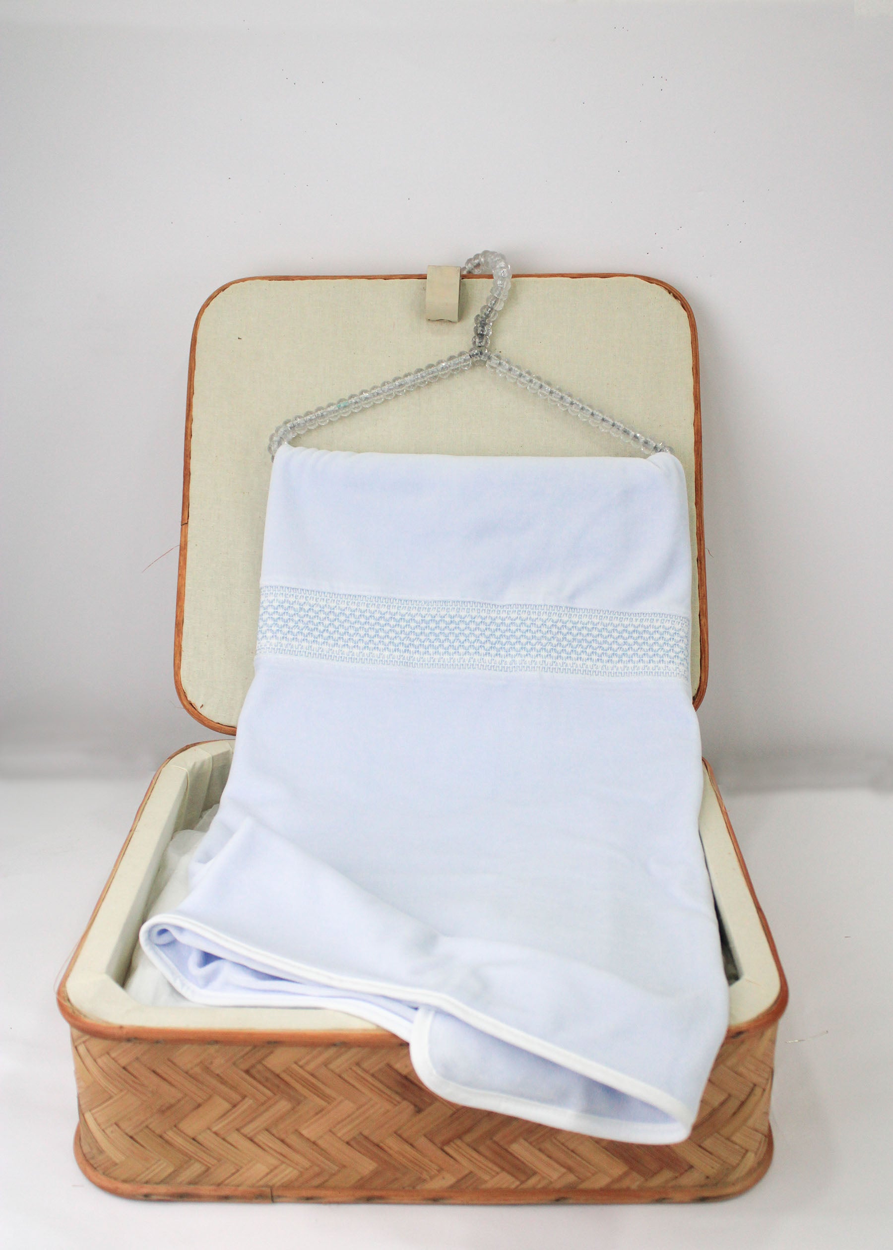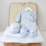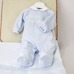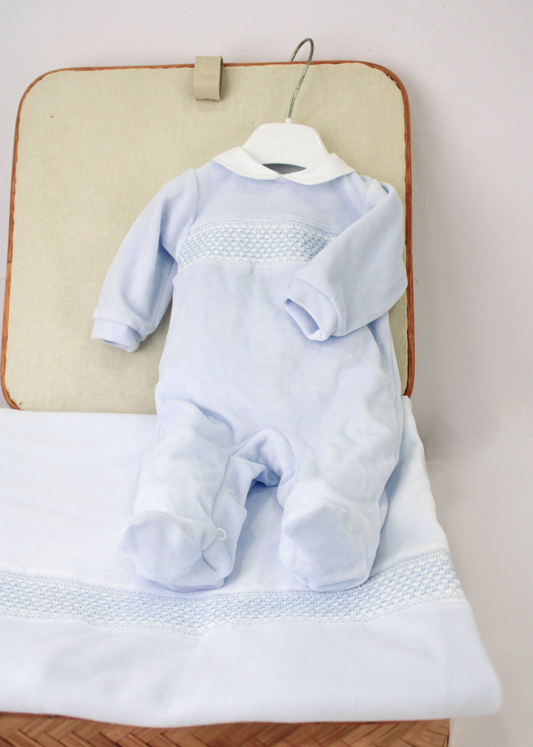 Il completo Deolinda in celeste per neonate è un set elegante e delicato, composto da una tutina, un cappellino e una coperta, tutti abbinati con cura. La tutina in ciniglia presenta un ricamo delicato sul petto e un colletto a contrasto, mentre il cappellino è decorato con un ricamo coordinato. La coperta, morbida e avvolgente, è anch'essa arricchita con un ricamo. Perfetto per il comfort e lo stile del tuo piccolo, questo set è ideale per ogni momento speciale.
