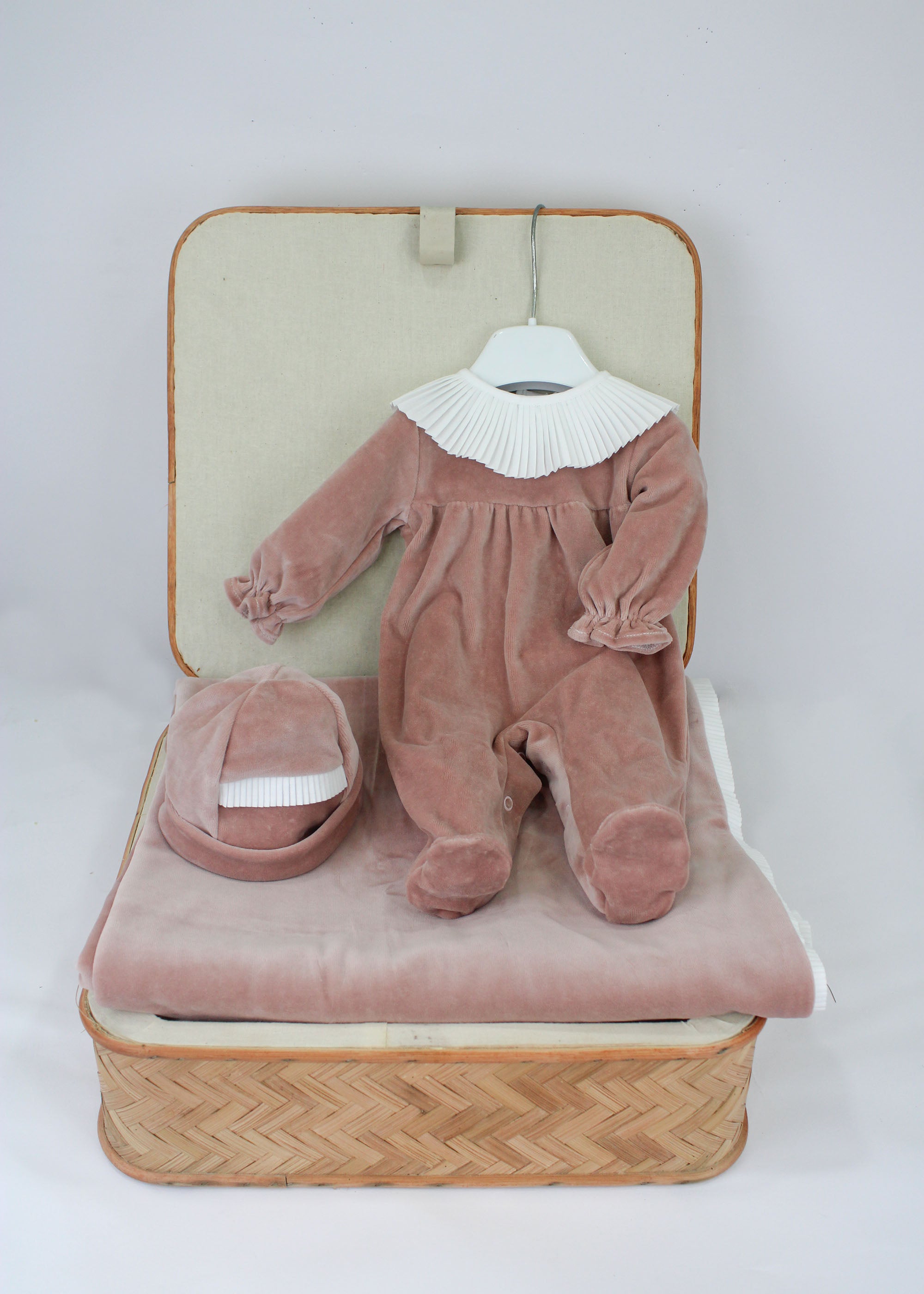 Il completo Deolinda per neonate in terracotta è l'ideale per le prime coccole. Questo set include una tutina con colletto a pagliaccio in contrasto, abbottonatura a pressione e piedini, una coperta morbida con bordino a contrasto, e un cappellino coordinato. Il delicato colore verde menta, unito ai dettagli di alta qualità, rende questo corredino perfetto per ogni occasione. Un set elegante e confortevole, che avvolge il tuo piccolo con tenerezza e stile.