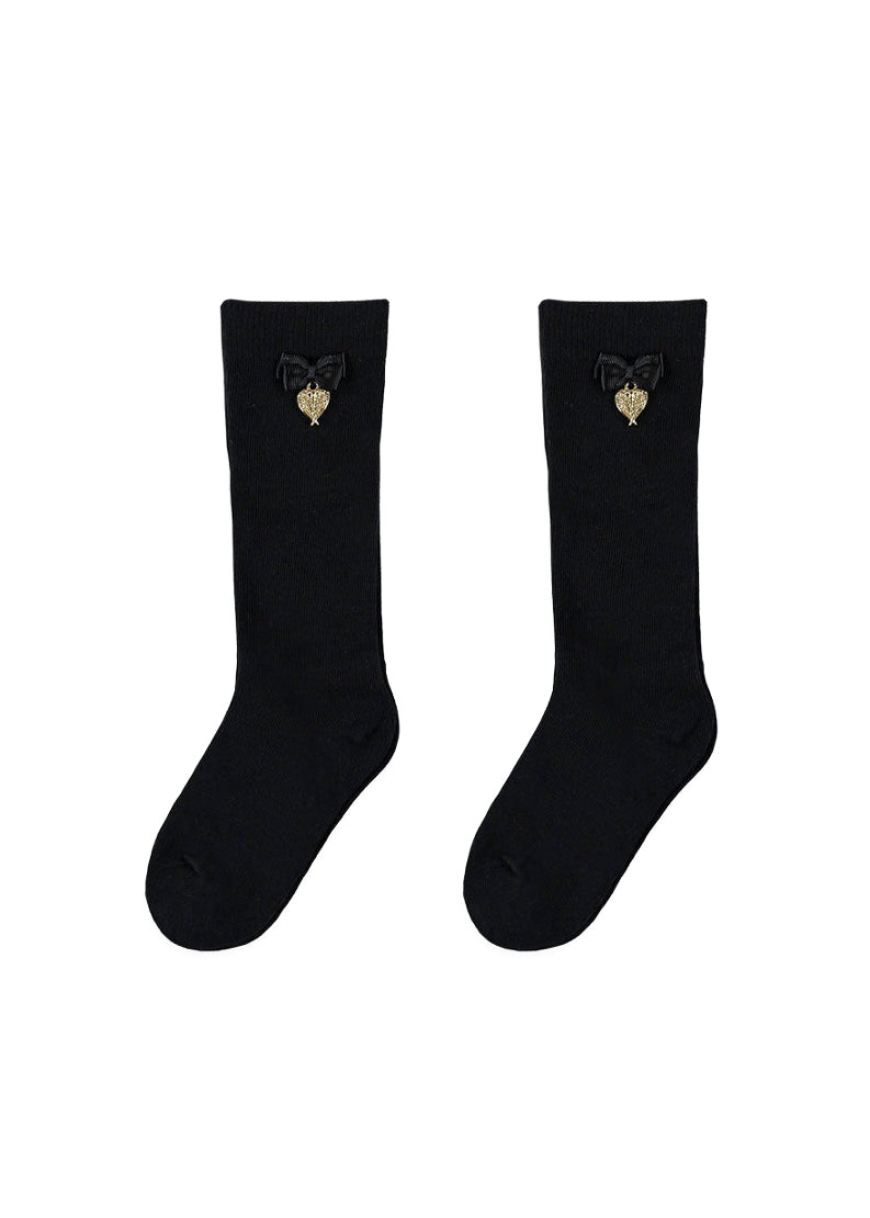 Charming Angel's Face black socks for girls are the perfect accessory to complete any elegant and refined look. Crafted from stretch cotton, these socks have a snug fit thanks to the ribbed tops, ensuring comfort and practicality. Featuring the signature bow and gold heart charm, which should be worn with the heart facing outwards, these socks add a touch of style and class. Available in a variety of colours to match every outfit in the Angel's Face collection, they are ideal for any occasion and perfect for completing your little girl's wardrobe, with a pair for every day of the week and beyond!
