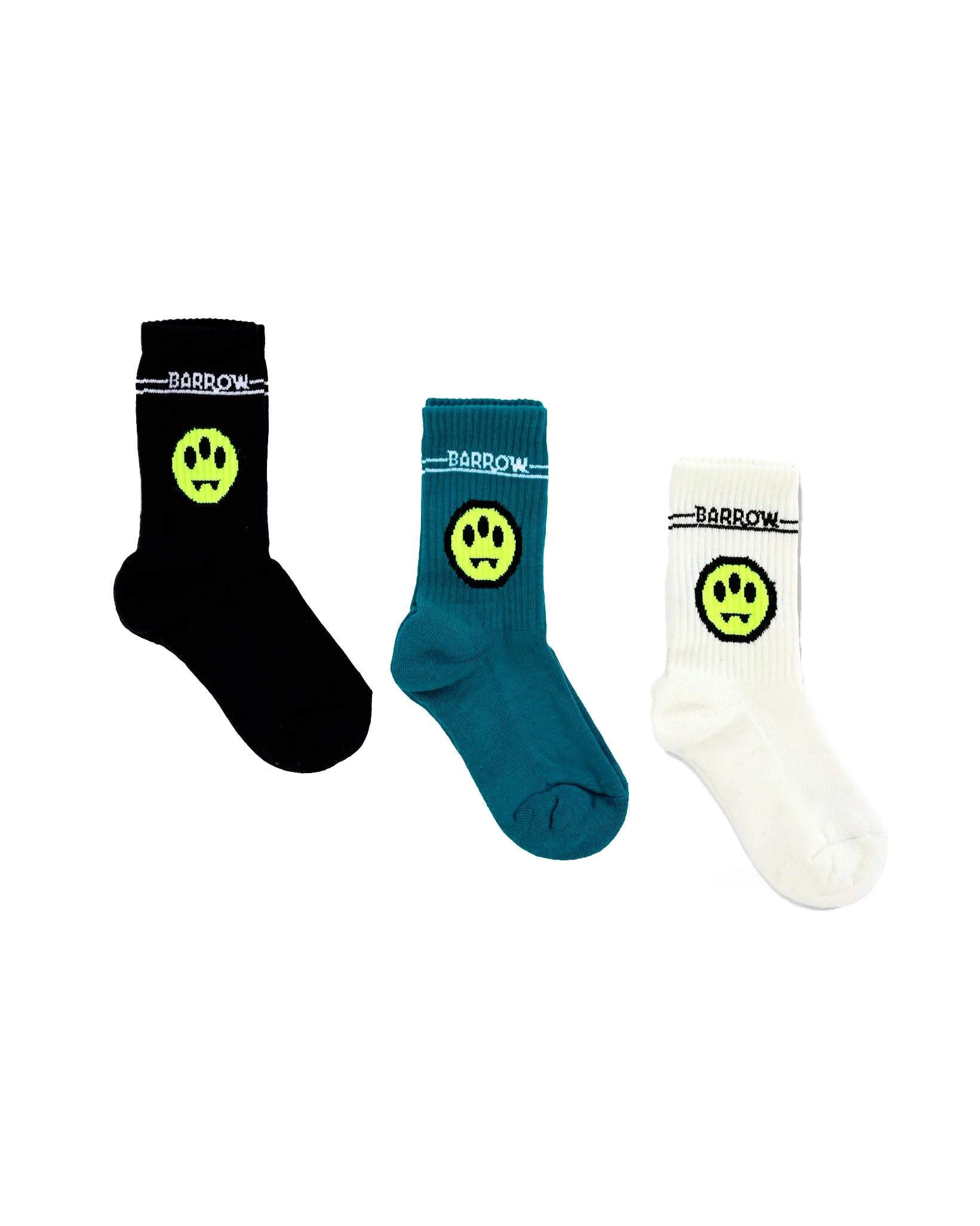 Il set comprende tre paia di calzini con gambale a costine, proposti nei colori verde, bianco e nero. Ogni modello è decorato lateralmente con l’iconico smile giallo e il logo Barrow, simboli distintivi del brand. Prodotti in Italia, garantiscono qualità e cura nei dettagli.