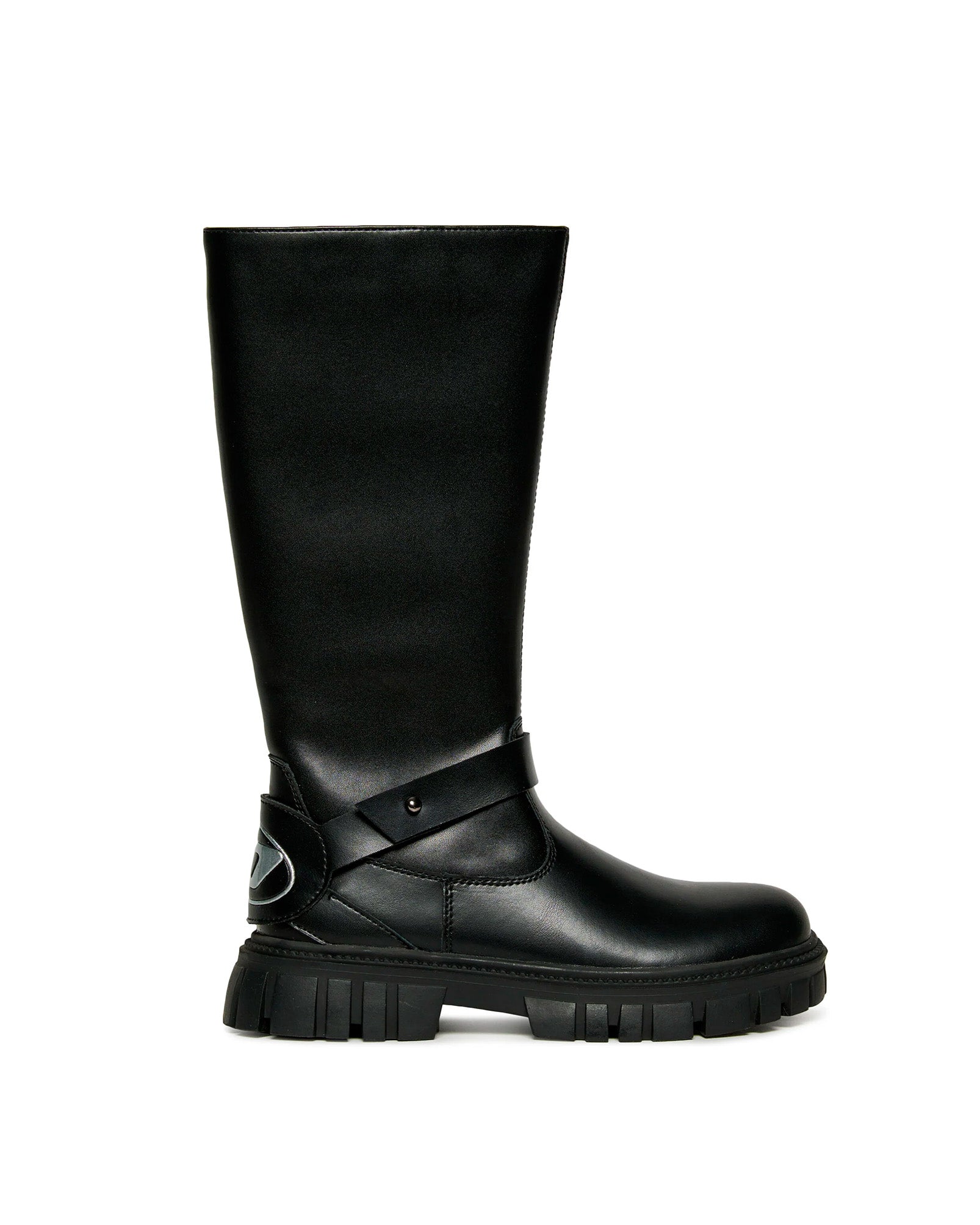 Il design include una pratica chiusura interna con zip che facilita la calzata, mentre la suola a carroarmato assicura stabilità e aderenza su ogni superficie. Il logo Oval D applicato sul retro completa il look con il tocco distintivo Diesel.