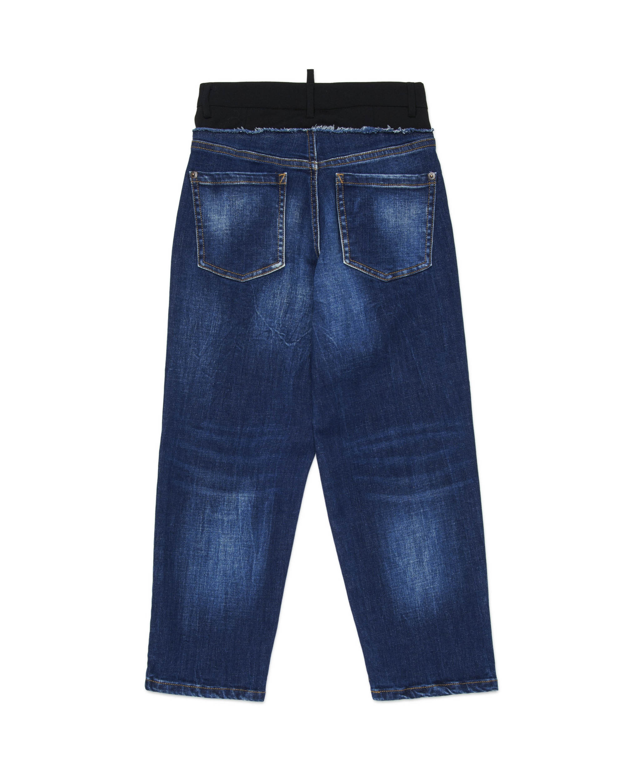 I jeans a doppio tessuto Dsquared2 Kids sono un capo versatile e sofisticato, perfetto per occasioni speciali. Realizzati in un mix di denim blu medio sfumato e un esclusivo inserto in fresco di lana in vita, offrono una combinazione unica di stile e comfort.