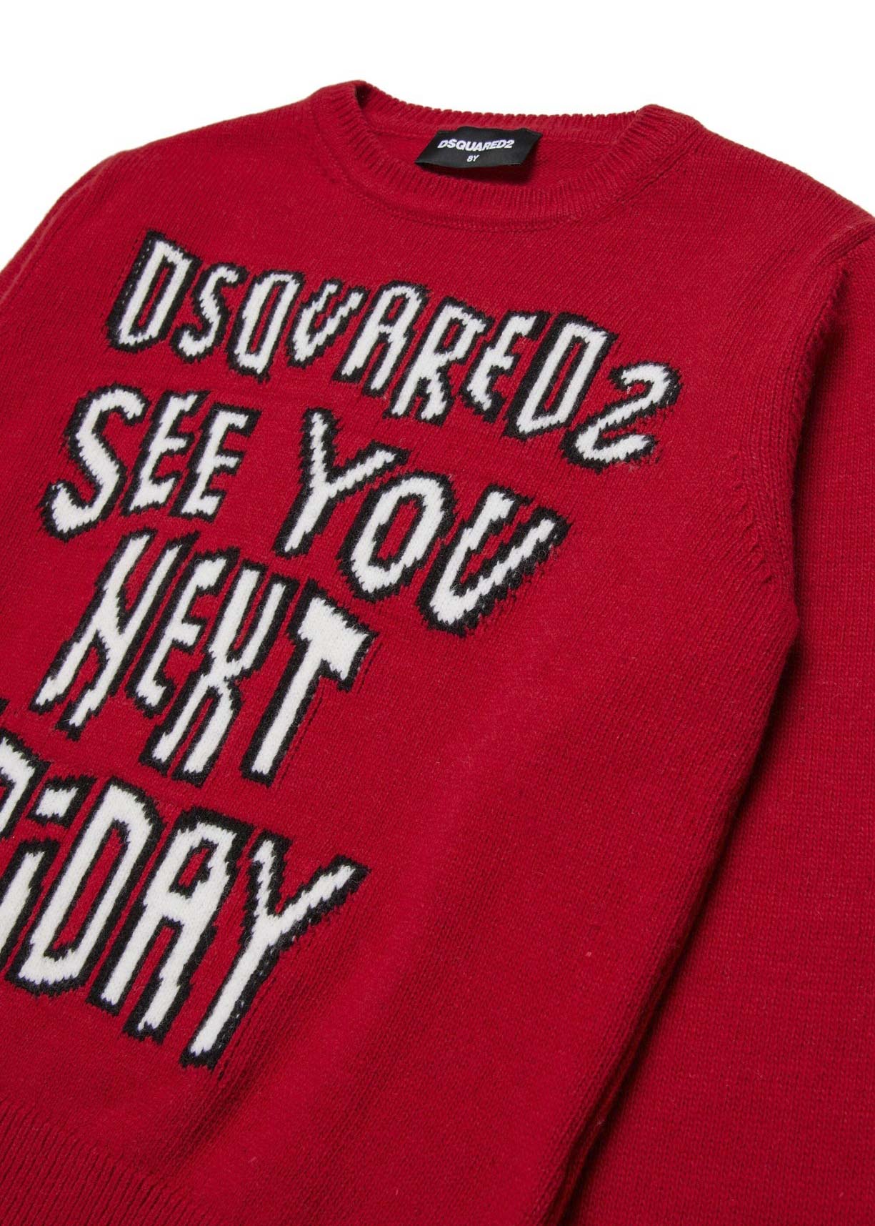 Il maglione rosso Dsquared2 Kids con intarsio lettering è un capo caldo e versatile che unisce comfort e stile iconico.