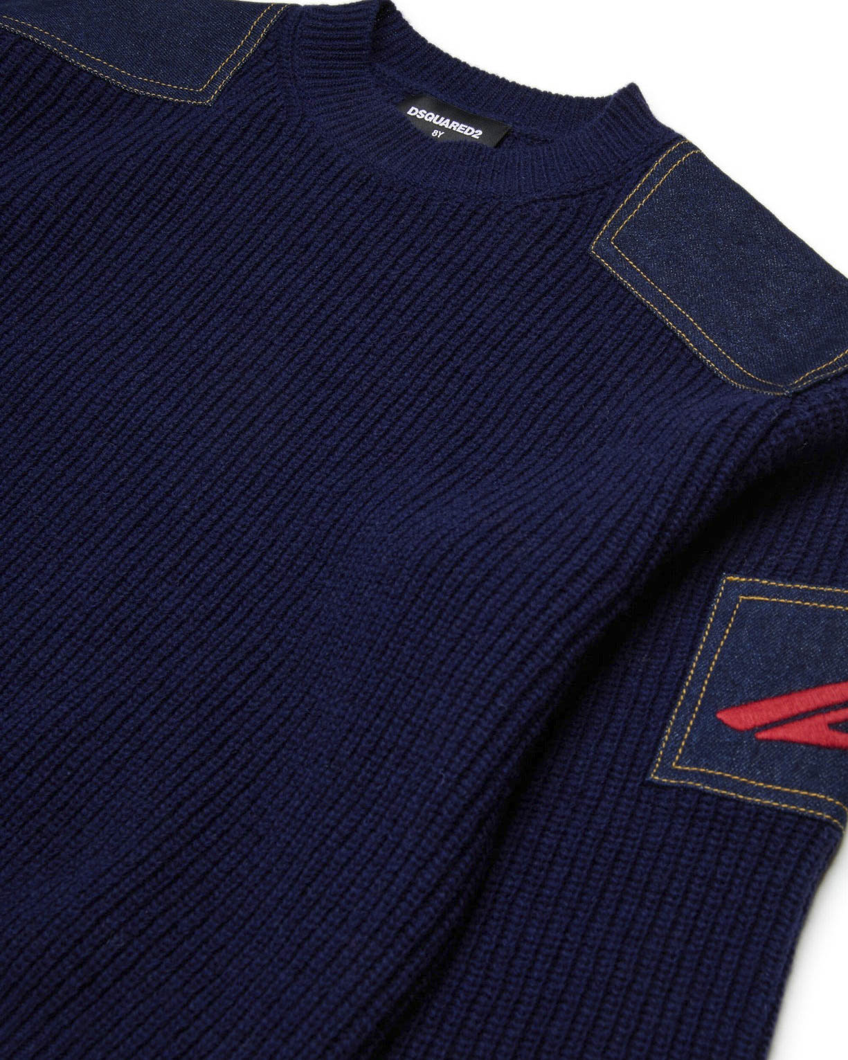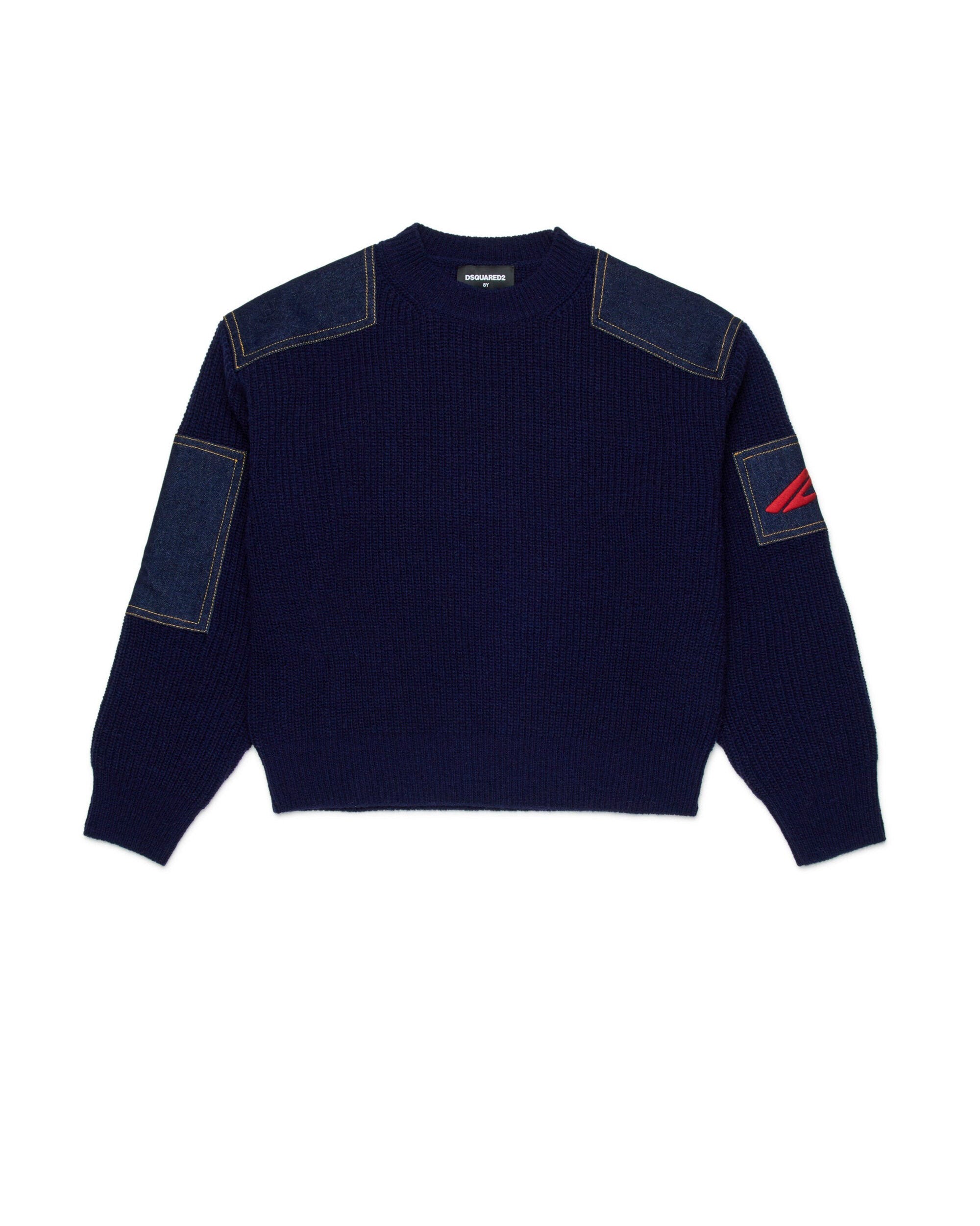 l pullover blu Dsquared2 Kids con inserti denim è un capo versatile e originale che unisce comfort e stile contemporaneo. Realizzato in misto lana lavorata a coste (70% lana, 30% poliammide), assicura calore e morbidezza durante i mesi più freddi, mantenendo un design alla moda.