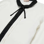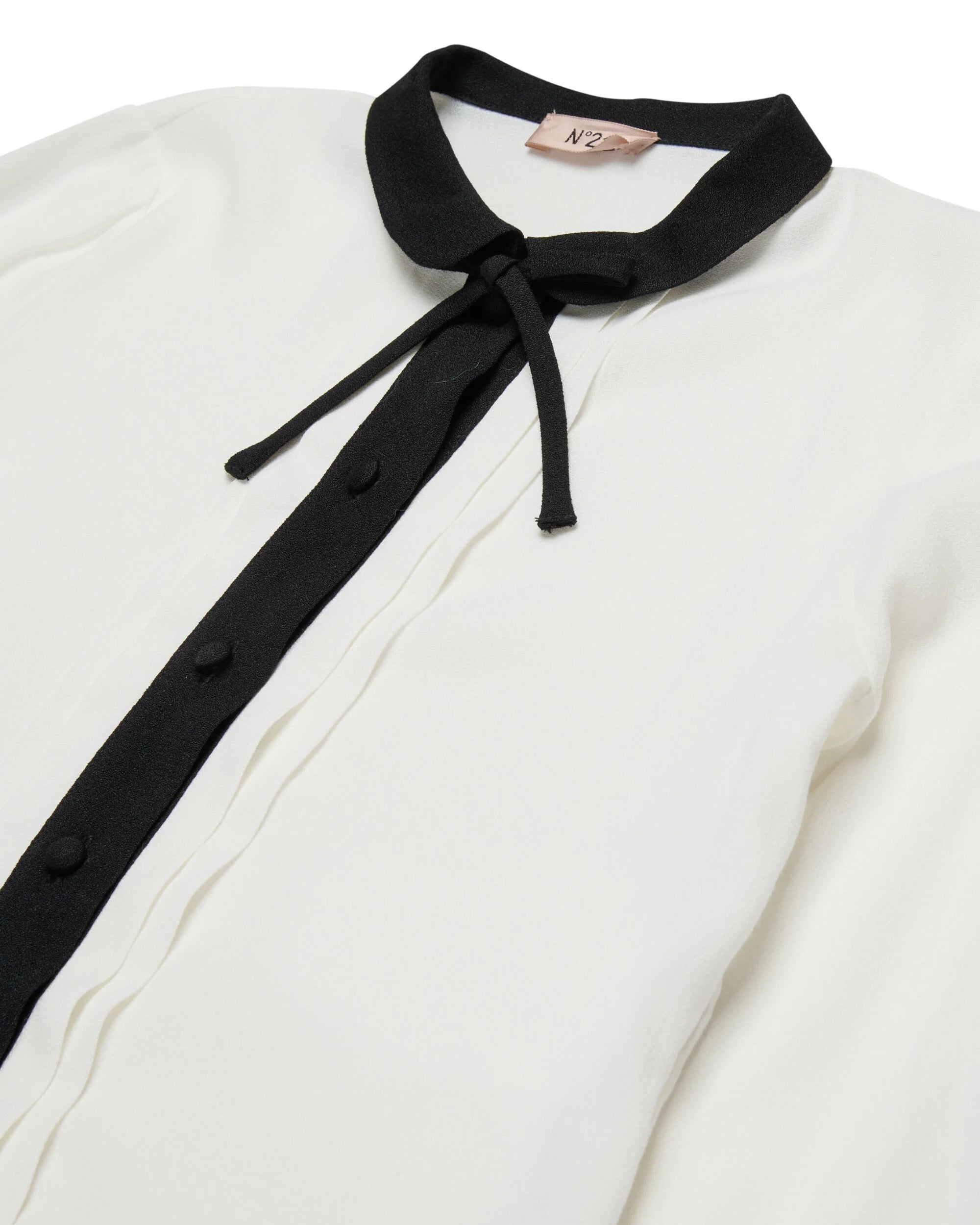 Camicia cropped N°21 in crêpe di viscosa, caratterizzata da un’elegante combinazione di colori a contrasto che dona personalità e raffinatezza al capo. Il modello presenta maniche lunghe e colletto classico impreziosito da un fiocchetto removibile, pensato per adattare lo stile a diverse occasioni, da quelle più formali ai look quotidiani ricercati.