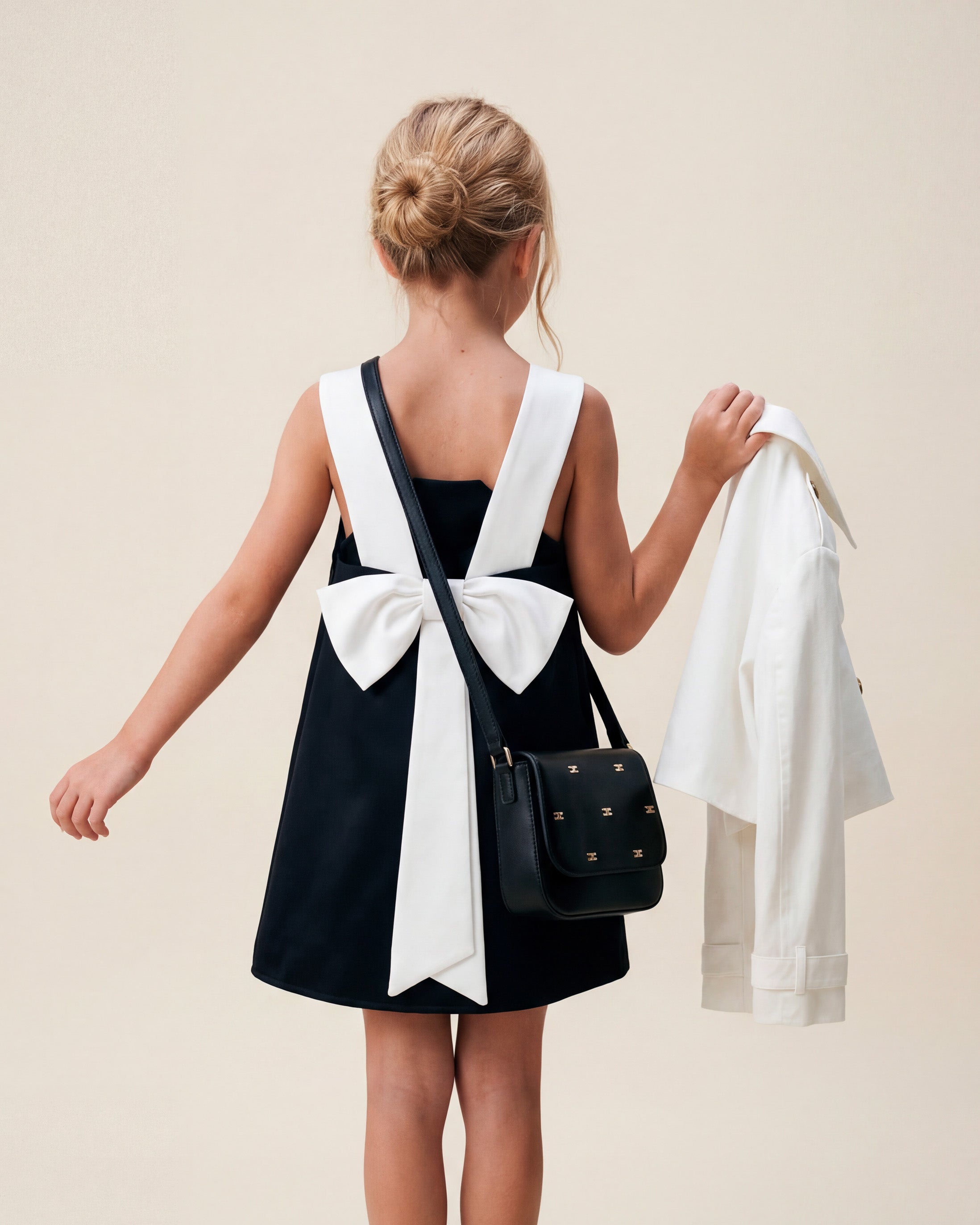 Abito Elisabetta Franchi La Mia Bambina in elegante combinazione nero/avorio, pensato per occasioni speciali e momenti da ricordare. Il design si distingue per il maxi fiocco, elemento scenografico che dona carattere e raffinatezza al capo.