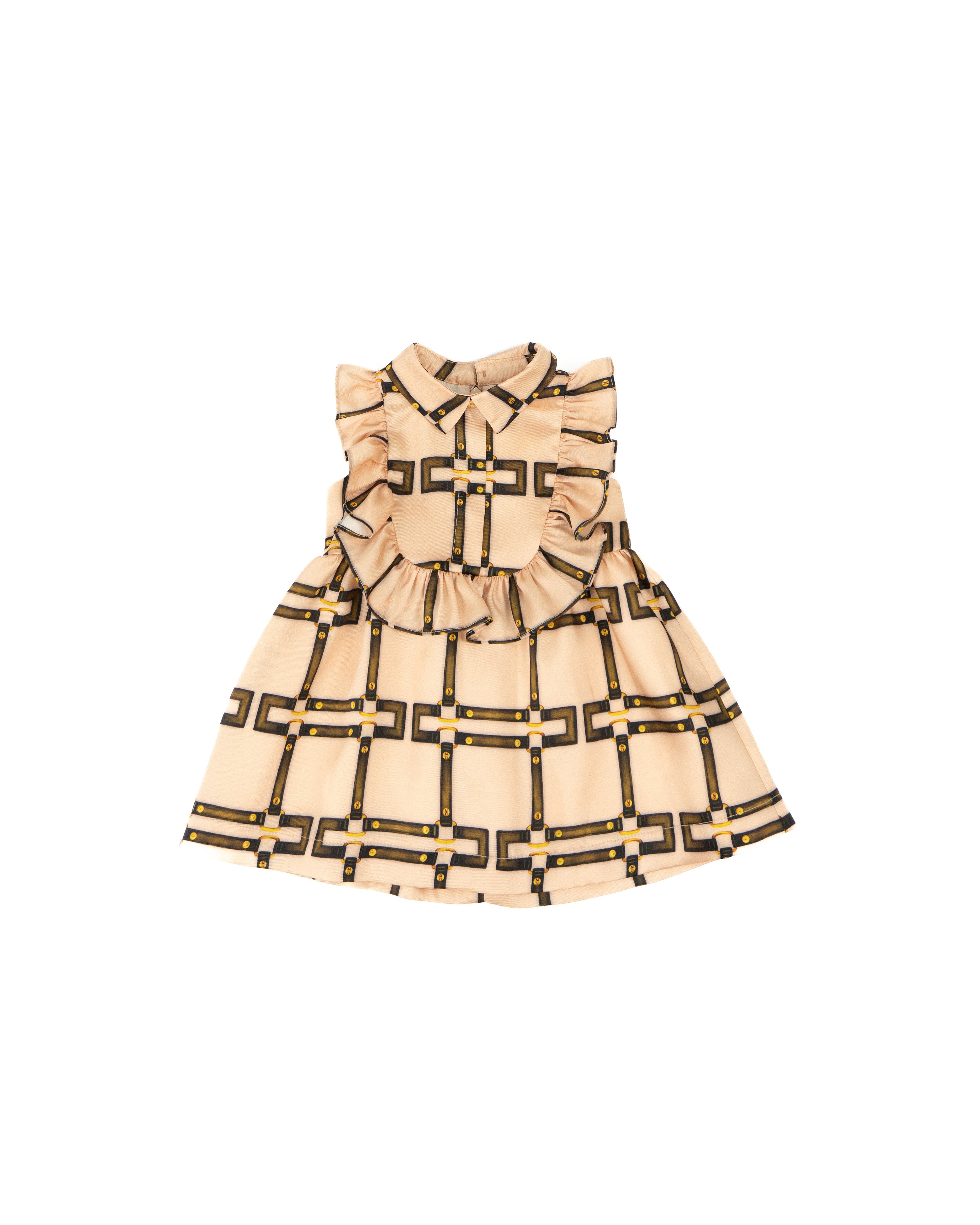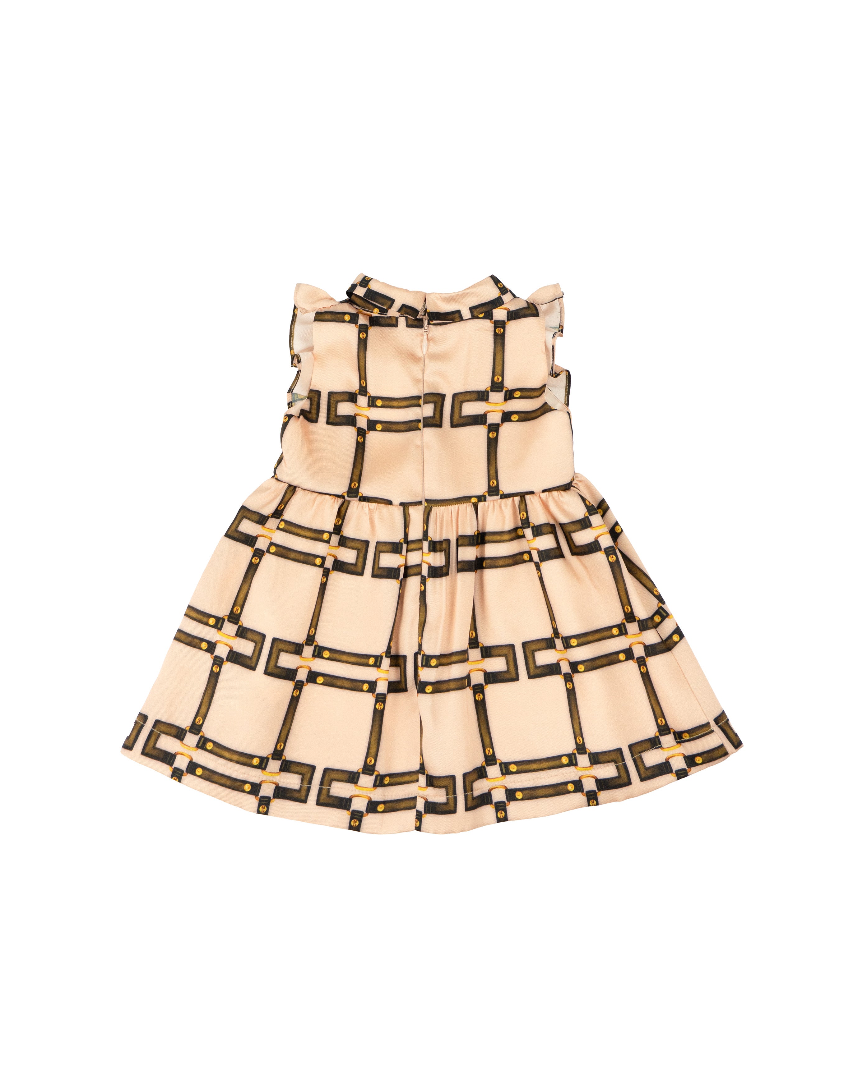 Elegante e ricercato, l’abito Elisabetta Franchi La Mia Bambina in tonalità pesca è impreziosito da un raffinato motivo catena all-over che richiama l’estetica iconica del brand. Il design è valorizzato da colletto strutturato, dettagli con profili a contrasto e balze decorative che donano movimento e volume alla silhouette. La gonna ampia completa il modello con un effetto armonioso e sofisticato, perfetto per cerimonie ed eventi speciali.
