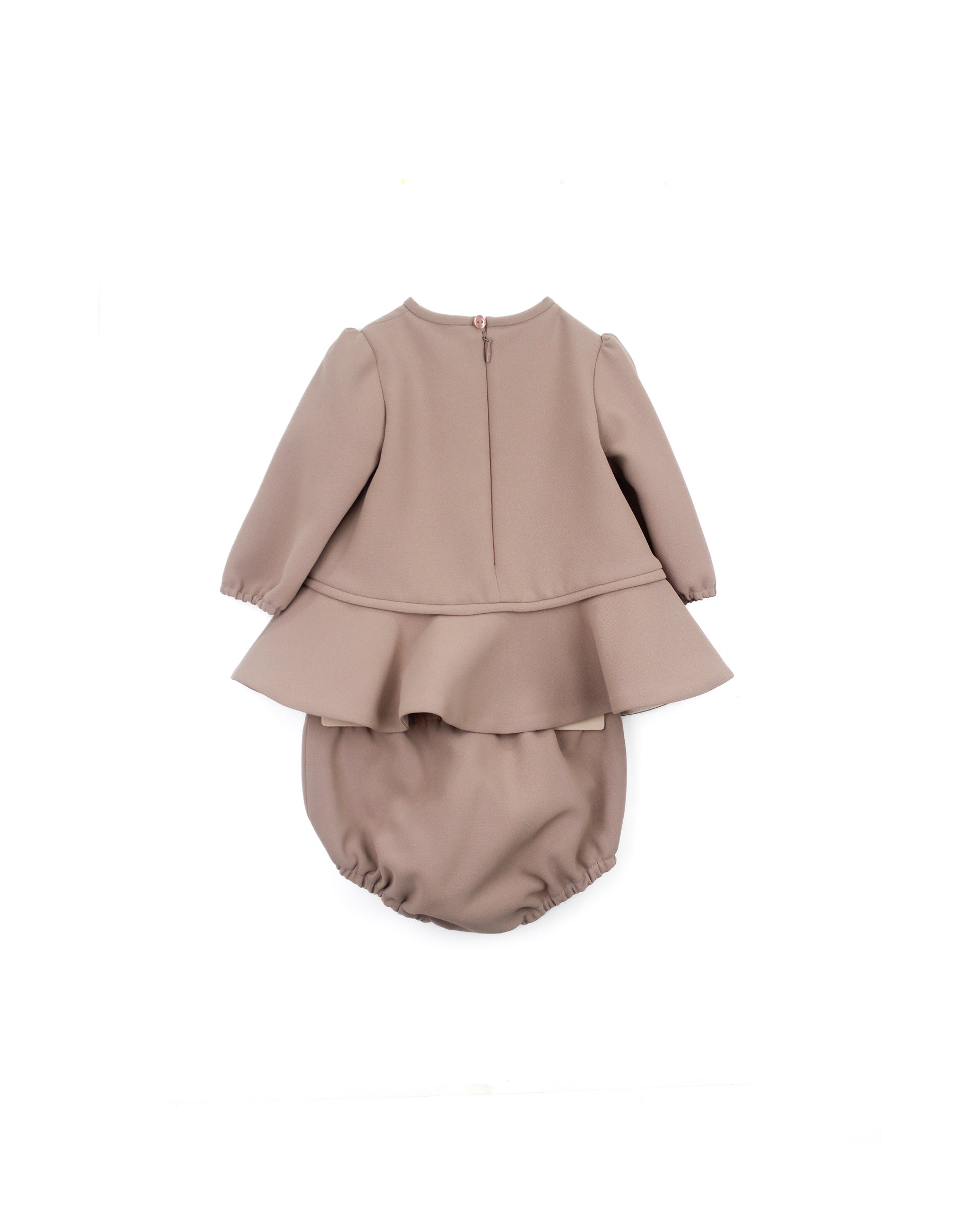 Il design elegante in tonalità rosa Sunrise è arricchito da dettagli curati e viene abbinato a una culotta coordinata, per un outfit completo e armonioso. Perfetto come idea regalo o come capo da corredino, rappresenta lo stile chic e senza tempo di Elisabetta Franchi.