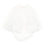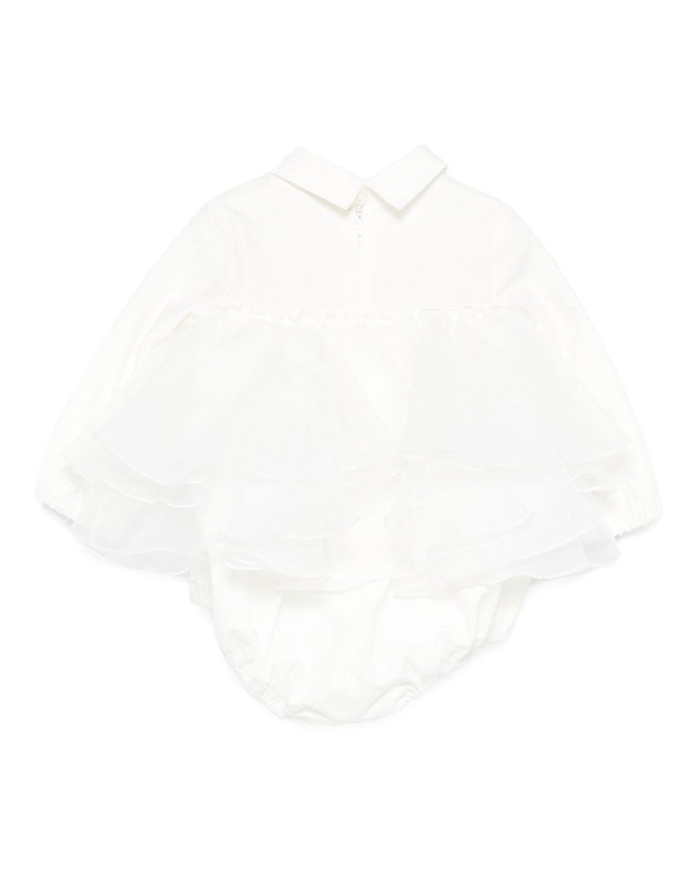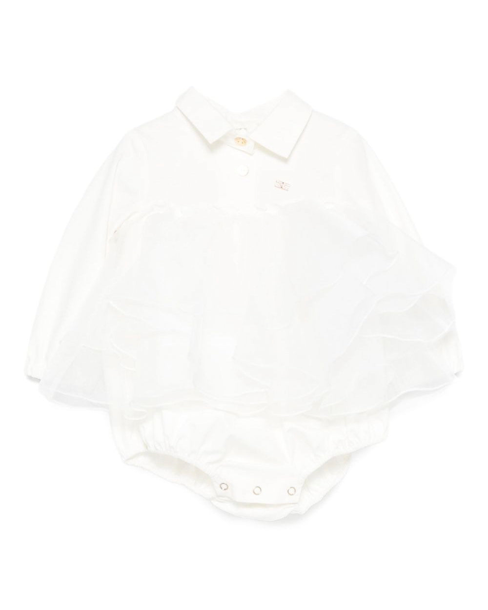 Quest'adorabile body è impreziosito da ruches a strati lungo il corpo, che aggiungono volume e raffinatezza. Lo scollo con colletto delicato incornicia il viso con grazia, mentre la placca logo discreta sottolinea il brand con eleganza. La chiusura a bottoncini automatici sul cavallo garantisce la massima praticità per i cambi.