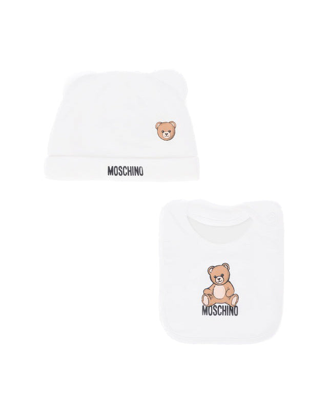 Il design è impreziosito da una delicata stampa con orsacchiotto Teddy e logo Moschino, simboli distintivi del brand. Il cappellino è abbinato a una bavetta coordinata, utile per proteggere la pelle e aggiungere un tocco di stile coordinato. Un accostamento pratico e chic pensato per la comodità quotidiana dei neonati.