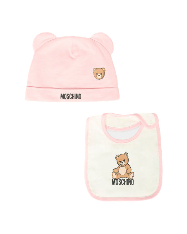 Il design è impreziosito da una delicata stampa con orsacchiotto Teddy e logo Moschino, simboli distintivi del brand. Il cappellino è abbinato a una bavetta coordinata, utile per proteggere la pelle e aggiungere un tocco di stile coordinato. Un accostamento pratico e chic pensato per la comodità quotidiana dei neonati.