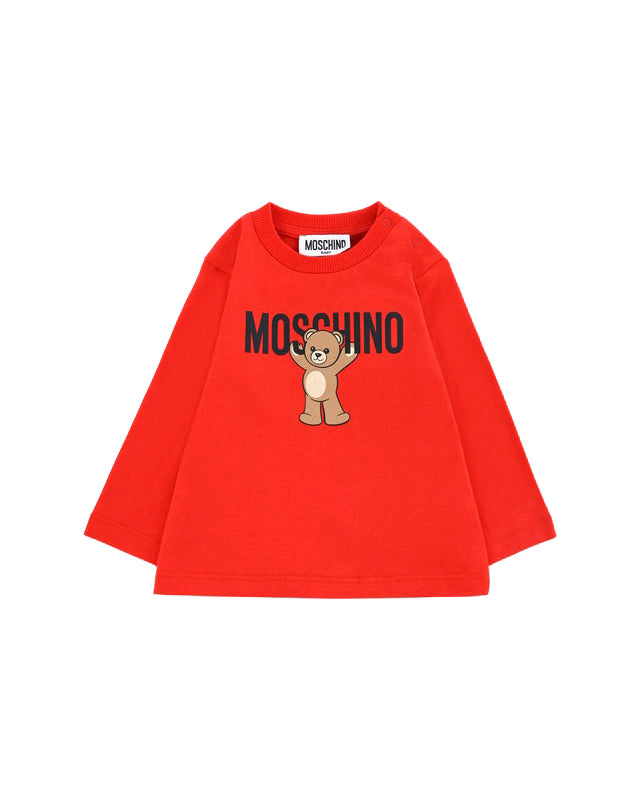 La T-shirt rossa Moschino Kids per neonati è un capo iconico e confortevole, perfetto per aggiungere un tocco di dolcezza e stile al guardaroba dei più piccoli. Realizzata in cotone morbido e traspirante, presenta un girocollo classico, maniche lunghe e una deliziosa stampa dell’orsetto Teddy Bear sul davanti, accompagnata dal riconoscibile logo Moschino.