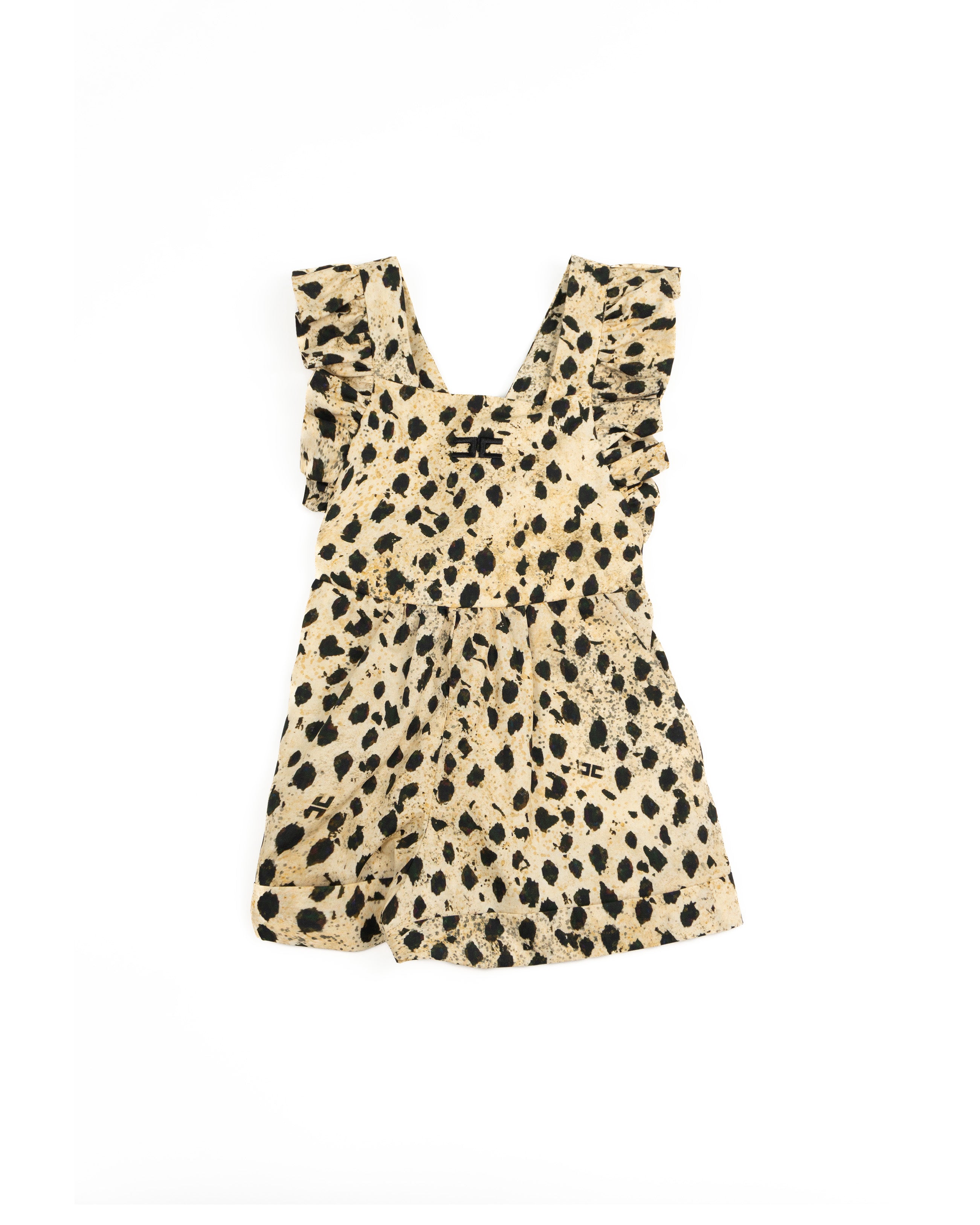 Abito neonata Elisabetta Franchi La Mia Bambina in cotone con stampa animalier, ispirato a uno stile safari contemporaneo e raffinato. Il design corto e svasato valorizza la silhouette con leggerezza, creando un look deciso ma equilibrato, perfetto per la stagione estiva.