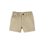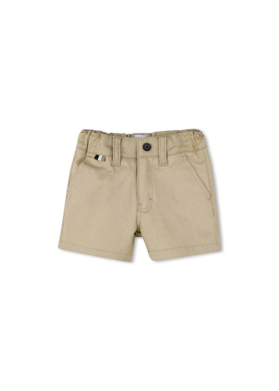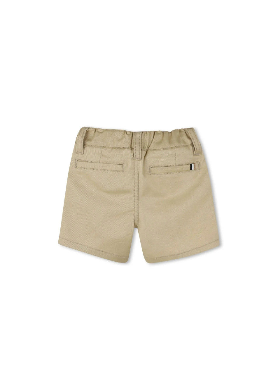 Add a touch of elegance and comfort to your baby's summer wardrobe with the "Beige Shorts by Boss Kids". Crafted from stretch cotton, these shorts offer a soft and flexible fit, perfect for accompanying your baby's every move. The front button fastening and belt loops give a sophisticated look, while the elasticated waist at the back ensures practicality and comfort. Featuring two side welt pockets and two hidden back pockets, these shorts combine style and functionality. The above-the-knee length makes them ideal for warmer days, ensuring freshness and freedom of movement.
