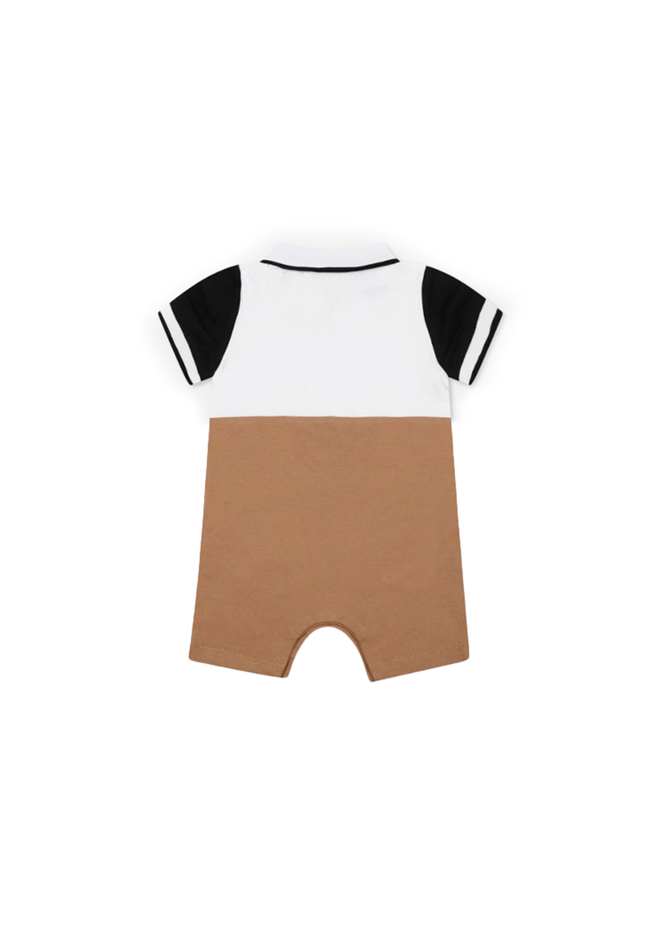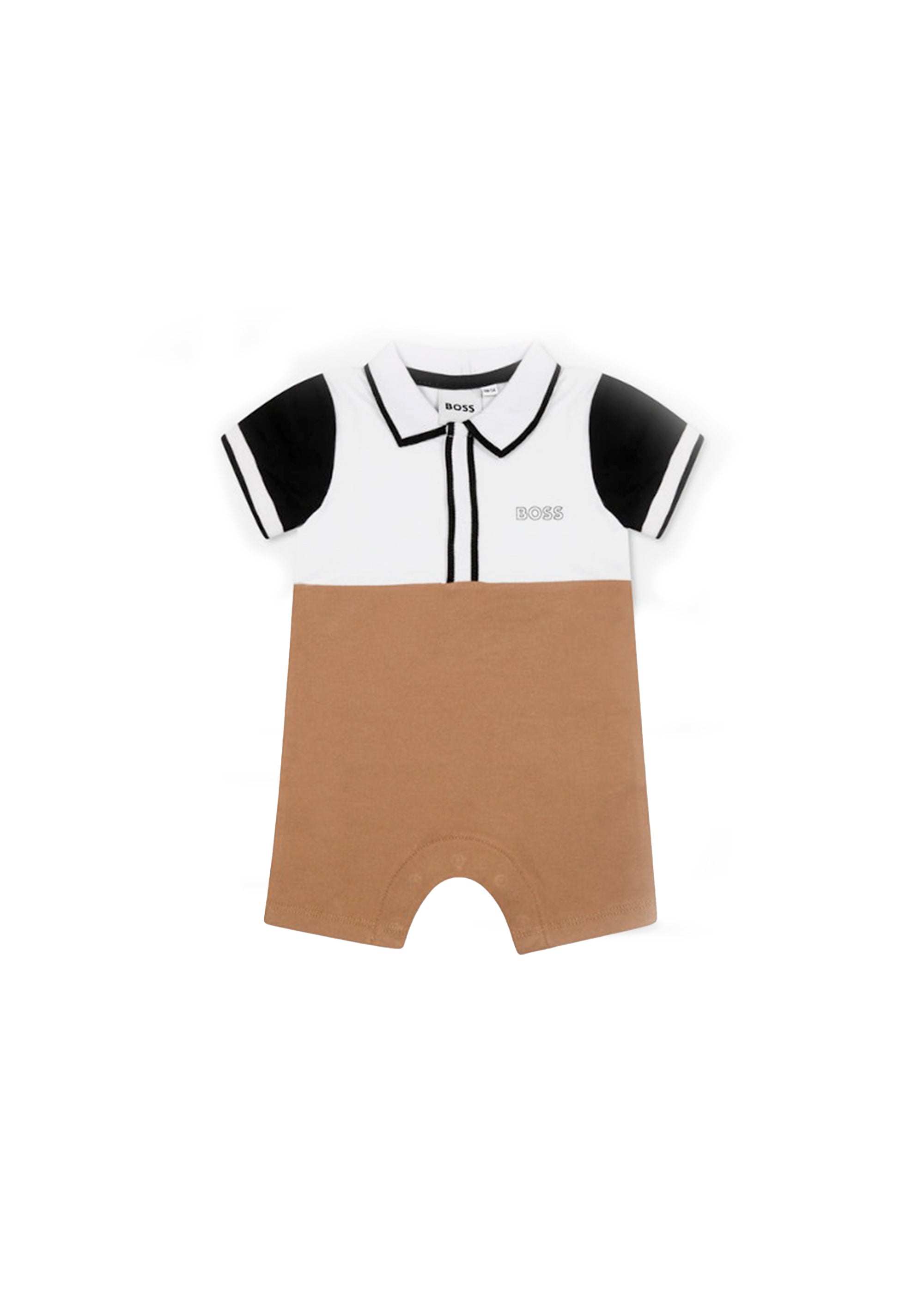 The Boss Kids Baby Sleepsuit in Biscuit is the perfect piece for your little one's comfort and style. Crafted from soft cotton, it features a concealed front fastening for a smart and practical look. The polo collar adds a refined touch, while the short sleeves are perfect for warmer days. A versatile and chic piece, it's perfect for any casual occasion and comfortable for day to day.