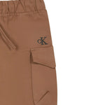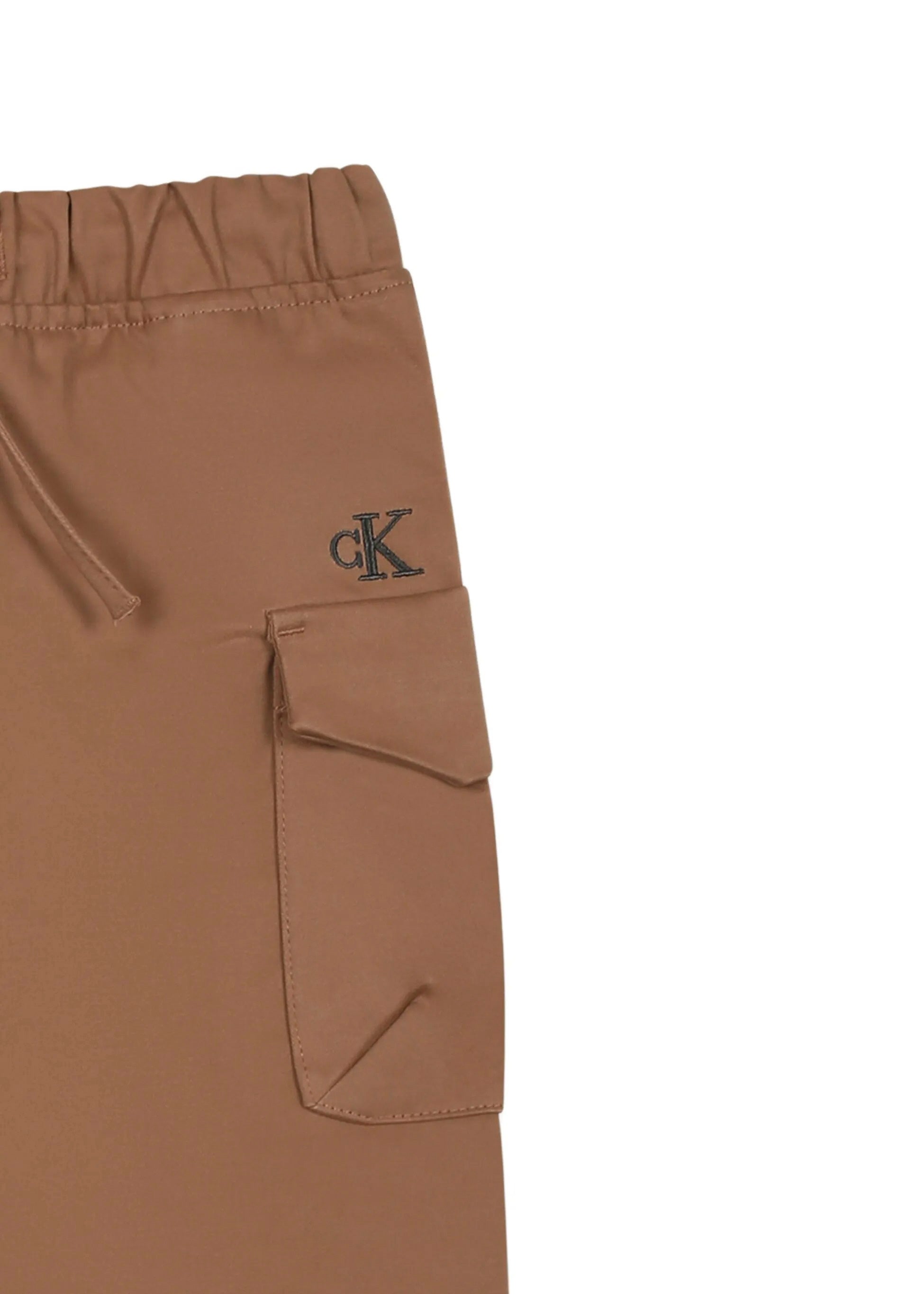 Calvin Klein Kids Biscuit Pants for baby boys combine comfort and style in a practical and modern design. Crafted from stretch cotton satin, they offer a regular fit and maximum freedom of movement thanks to the elastic waist with adjustable drawstring. Elasticated cuffs at the ankles ensure a perfect fit, while practical cargo pockets and curved seams on the back add functional details. The Calvin Klein monogram logo embroidered on the side completes the look with a touch of understated elegance. Perfect for completing any casual outfit, they are ideal for any everyday occasion of your little one.