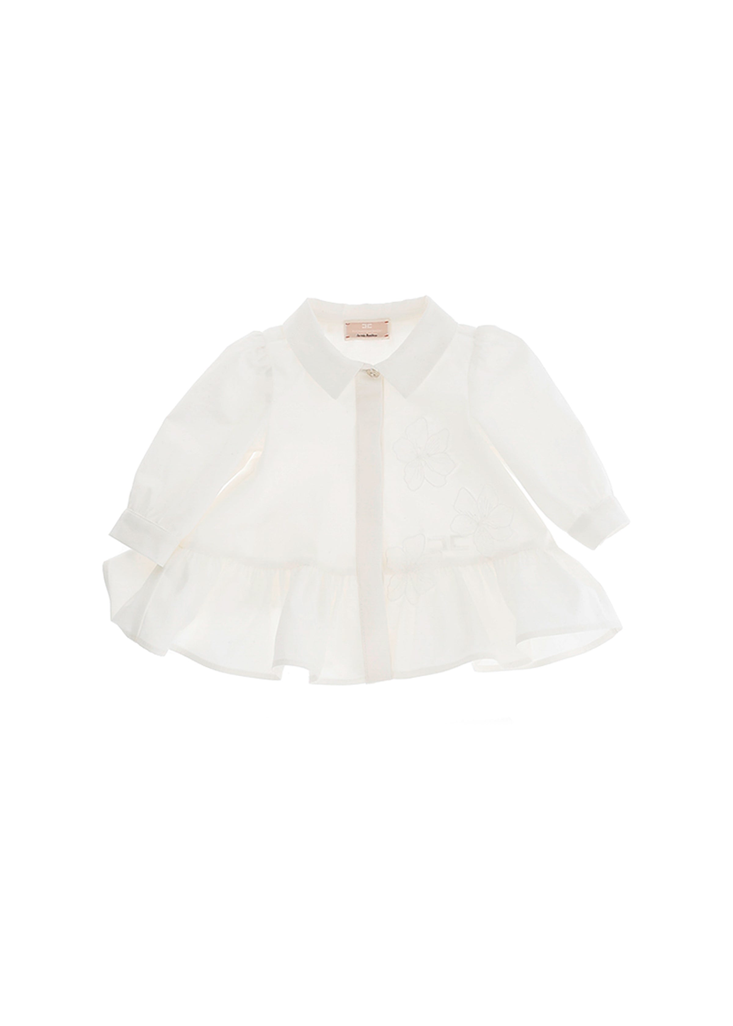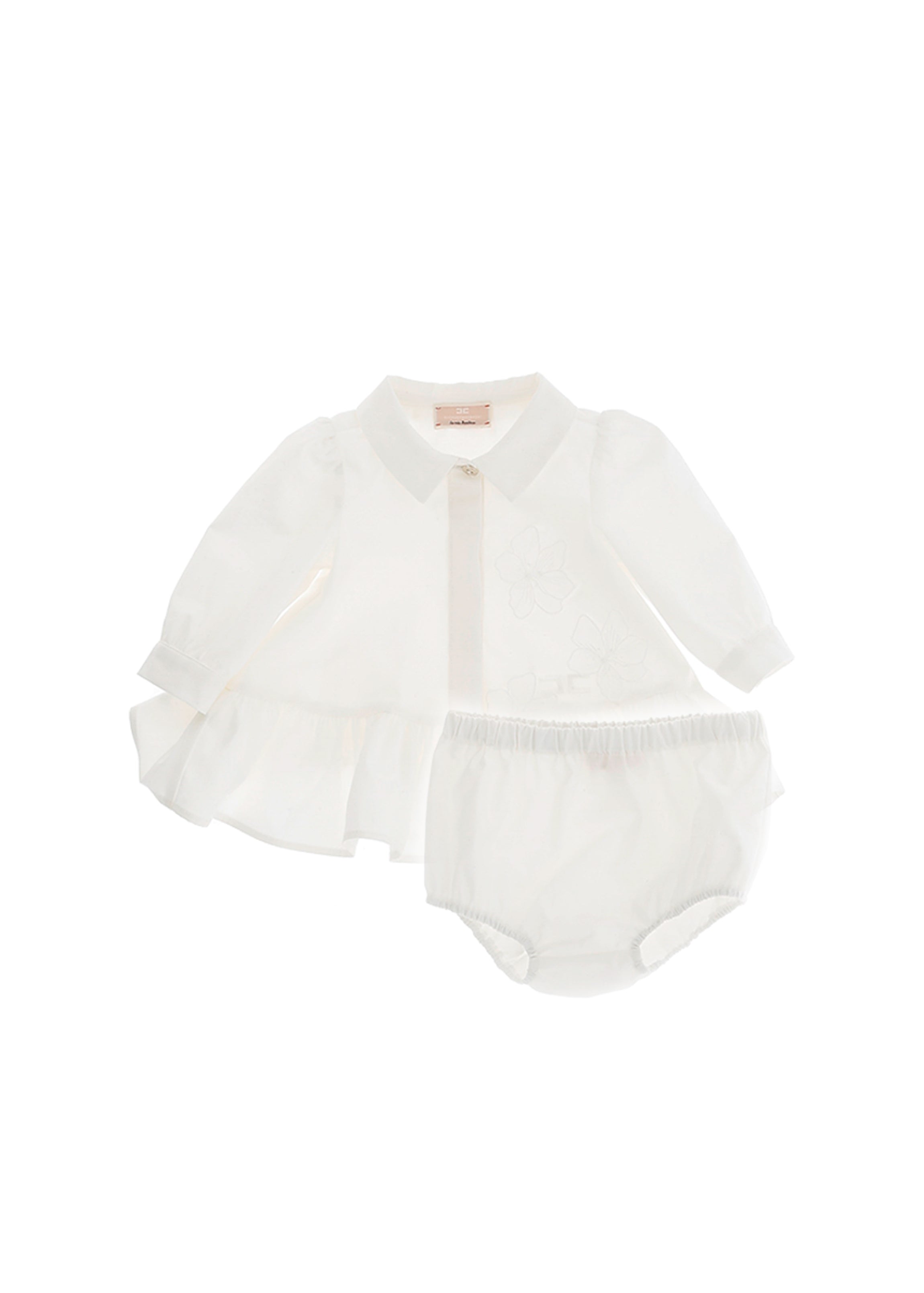 Make your newborn's look special with the Panna Dress with Ruffles by Elisabetta Franchi La Mia Bambina. Crafted from soft, high-quality fabric, this dress offers maximum comfort for baby's delicate skin. The design features long sleeves for greater protection and a sophisticated look, while the floral appliques add a romantic and refined touch. Completed with a matching culotte, it is perfect for special occasions or for an elegant and delicate outfit.