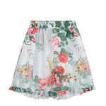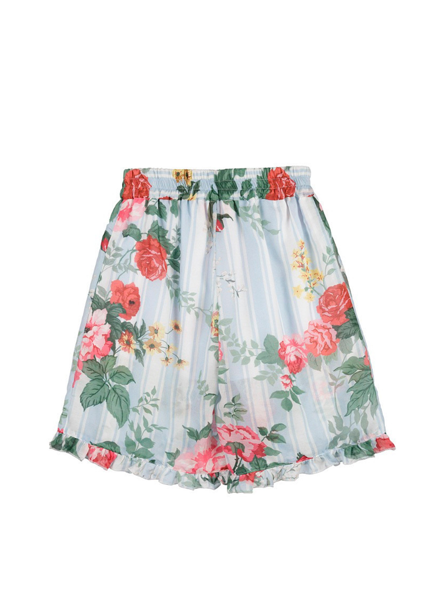 The Vivetta Kids light blue Bermuda shorts for girls are an elegant and versatile piece, perfect for any occasion. With a delicate floral print that matches the coordinated blouse, these trousers offer a complete and sophisticated look. The relaxed fit and elasticated waist ensure maximum comfort and freedom of movement, making them ideal for little ones who love to play in style. Details such as ruffles and roses add a romantic touch, making these Bermuda shorts perfect for creating a harmonious outfit, from school to special outings.